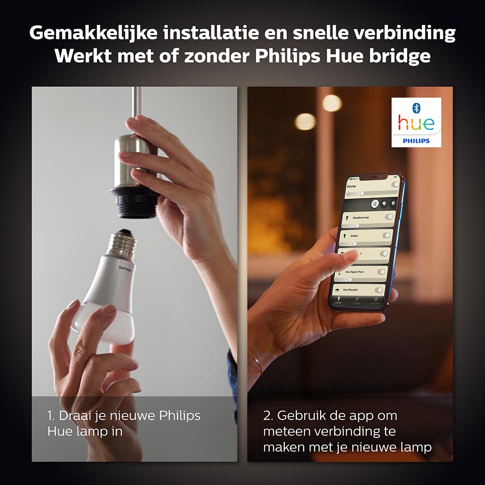 Creëer gemakkelijk en snel de juiste sfeer met deze 2 dimbare LED lampen. De lamp geeft een sfeervolle warm witte verlichting. De lamp wordt gemakkelijk bediend met de Philips Hue Bluetooth app. Zo kunt u de lamp gemakkelijk en snel aan/uit schakelen, dimmen of van kleur veranderen. Deze sfeervolle lamp is ook aan te sluiten op de Hue bridge om zo uw persoonlijke setting af te maken. Ook te bedienen met je stem via Google assistant of Alexa.