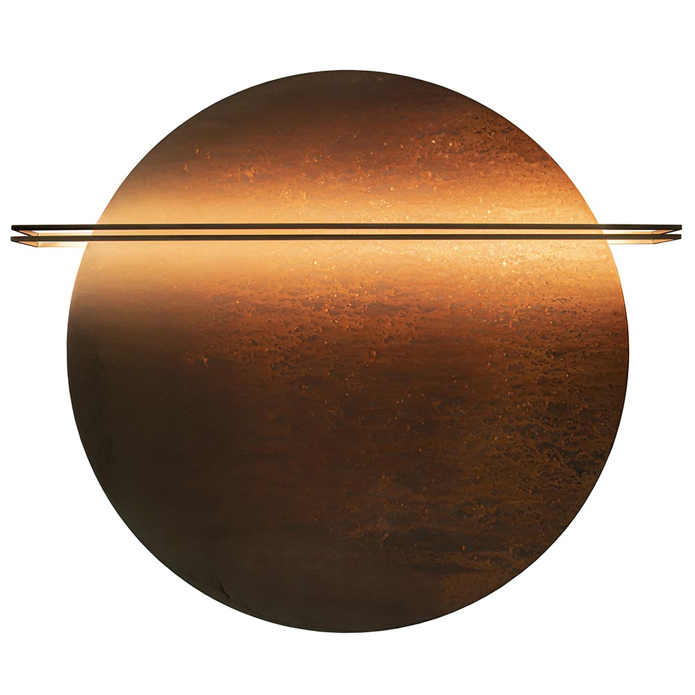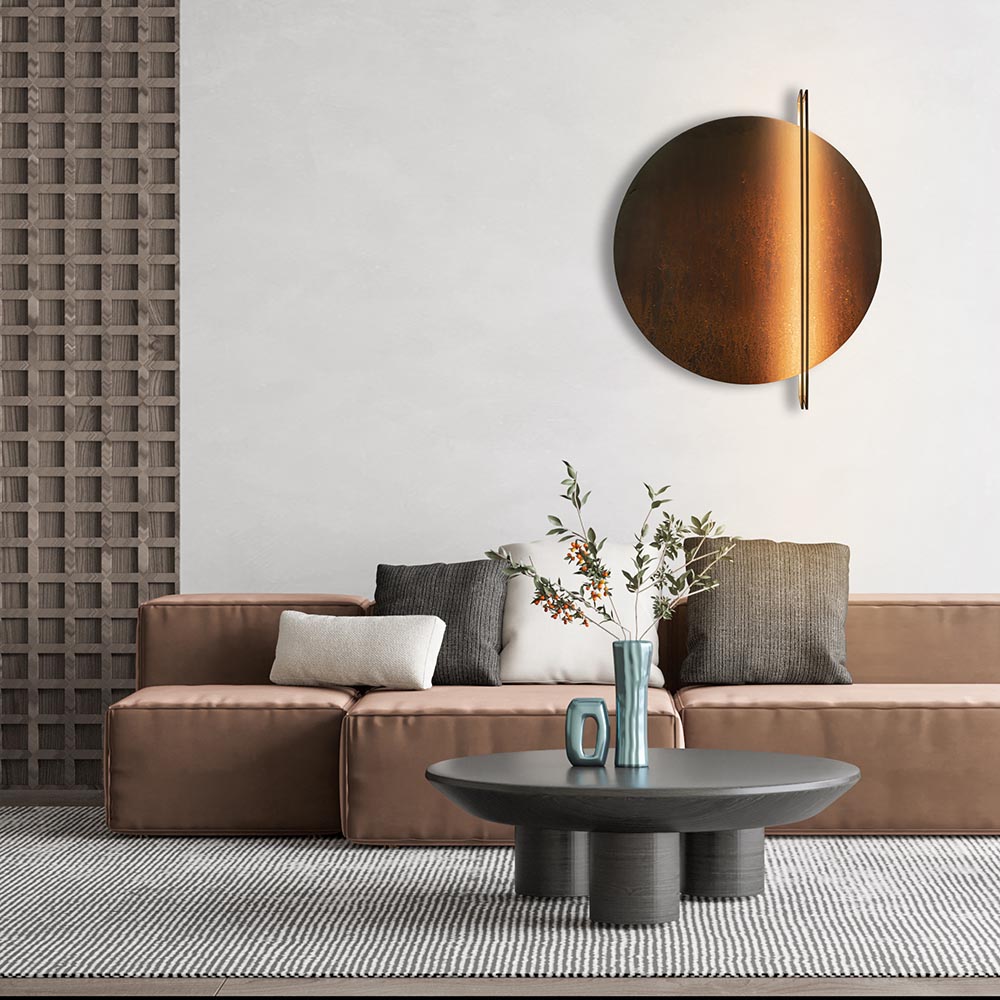 Deze prachtige led lamp kan zowel een wandlamp als een plafondlamp zijn. Deze mooie led lamp bestaat uit een ronde metalen plaat met twee bronzen balken. In deze balken zit een led strip die schijnt op de roestige plaat. Deze lamp is een echte eyecatcher met een prachtig minimalistisch ontwerp. De design lamp is te draaien zodat u zelf de gewenste positie bepaald voor de gewenste look. Ook kunt u kiezen om de LED strips uit het midden te plaatsen of precies in het midden van de plaat. Dit bepaald u voordat u de lamp monteert.