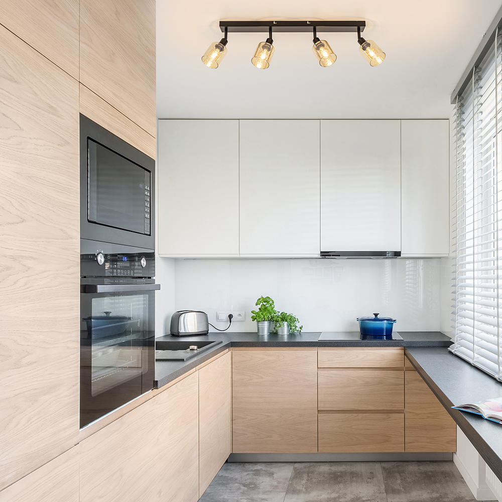 – afm: 65x8x22 cm – bevestiging: 65x8x2,5 cm – kappen: Ø8×13,5 cm – metaal, mat zwart – amber glas – verstelbaar – exclusief lichtbron (4x E14) – dimbaar (exclusief)