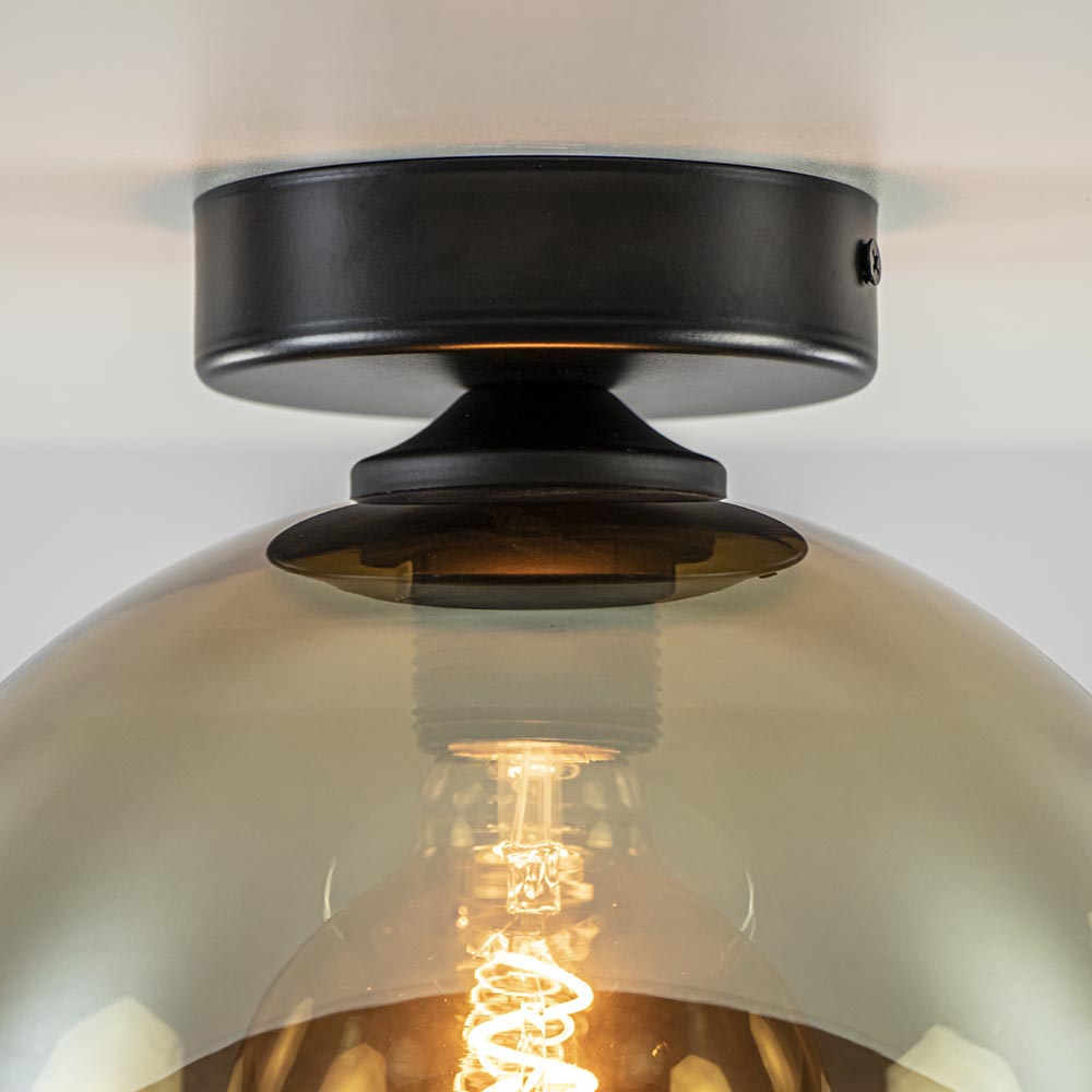 Een chique plafondlamp met een luxe uitstraling. De plafondlamp heeft een smoke glazen bol als kap die wordt bevestigd op een zwart metalen bevestiging. Het donkere glas zorgt voor de luxe uitstraling en de combinatie met het zwart maakt de plafondlamp prima geschikt voor verschillende woonstijlen. De ronde plafondlamp is dimbaar middels een externe dimmer en wordt geleverd zonder lichtbron (E27). Ideaal voor in een hal, slaapkamer of woonkamer.