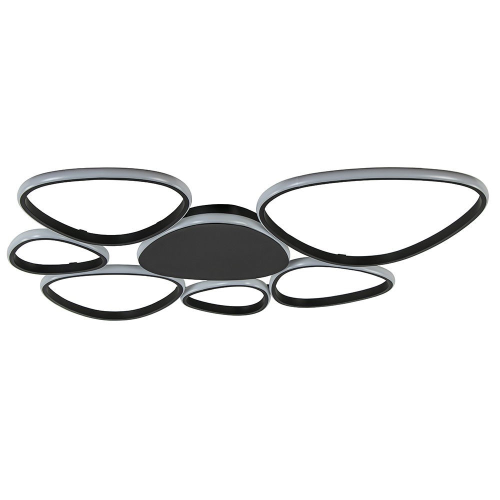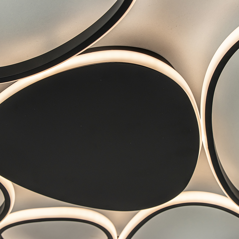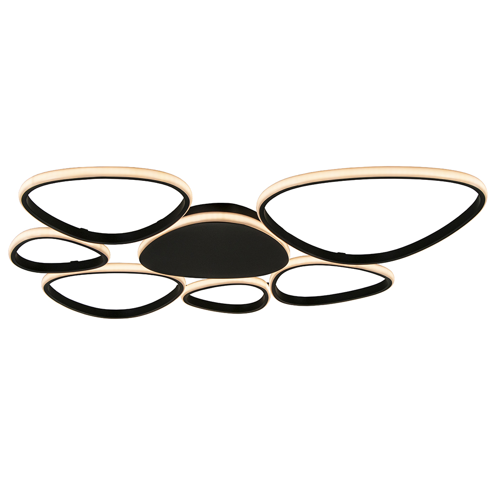 Deze prachtig vormgegeven plafondlamp is een ware eyecatcher in het interieur. De moderne plafondlamp is voorzien van geïntegreerd LED welke dimbaar is middels een externe dimmer (exclusief). De grote LED lamp heeft een strak design met een speelse twist. Het armatuur is volledig uitgevoerd in het zwart en is voorzien van meerdere LED strips. Dit zorgt ervoor dat de plafonnière een goede lichtopbrengst geeft en met 2700 Kelvin een sfeervolle warm witte verlichting. Ideaal voor in een hal of slaapkamer.