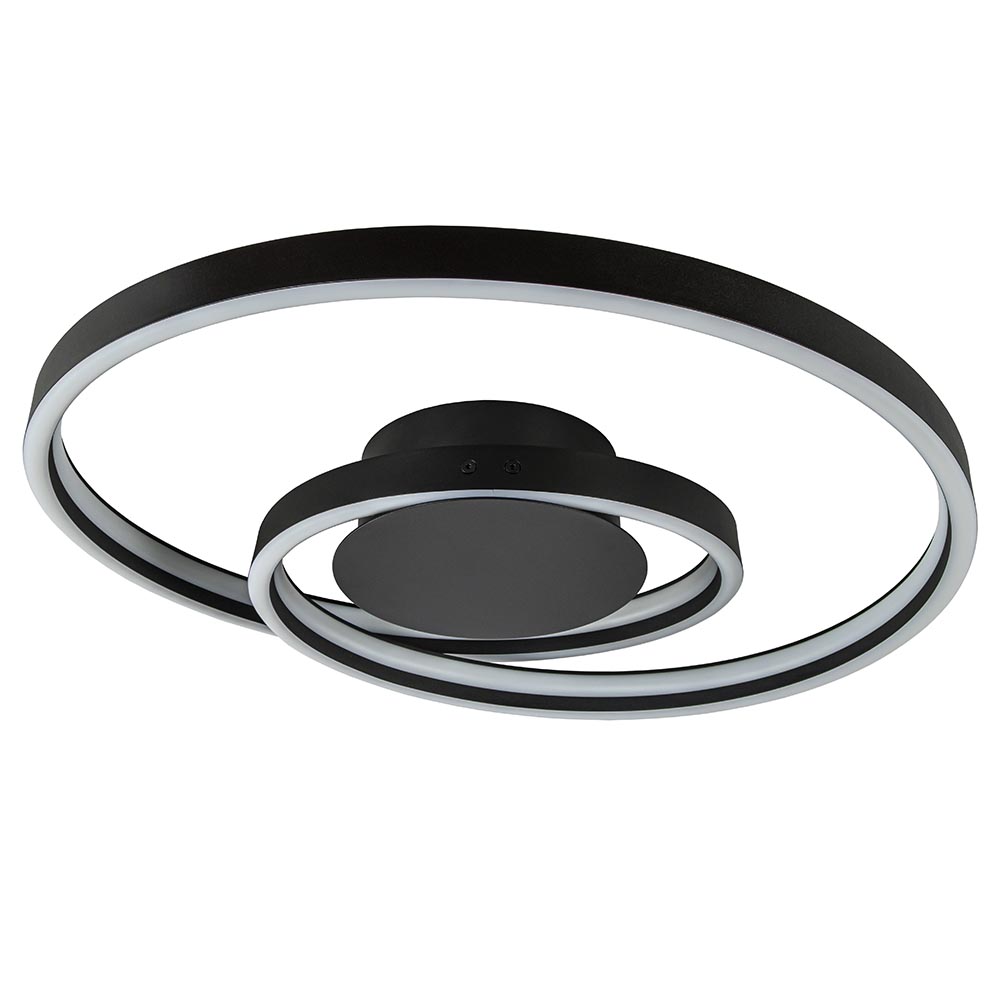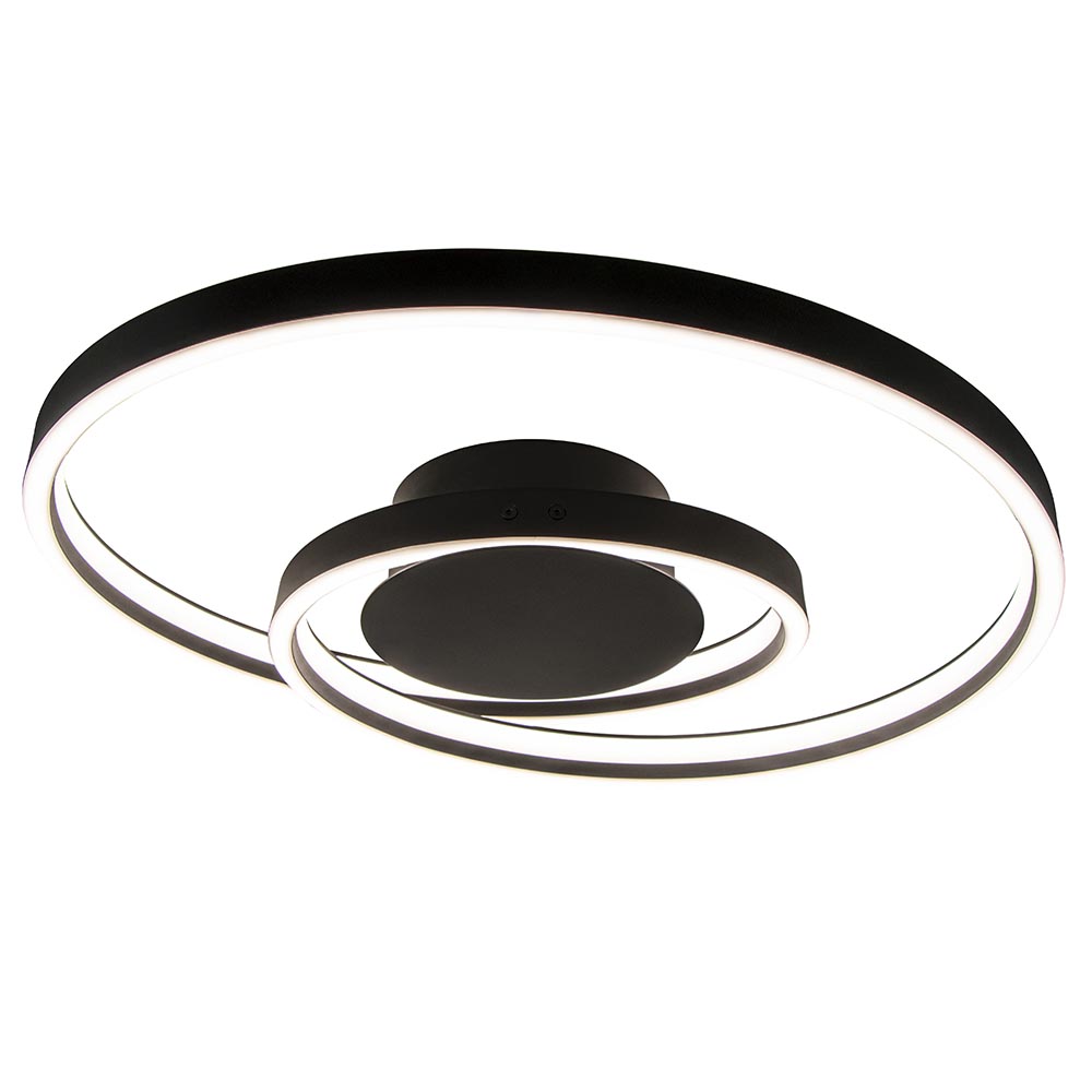 Een moderne plafondlamp met een strak design. De mat zwarte plafondlamp bestaat uit twee ringen die in elkaar overlopen. De plafondlamp heeft twee LED strips, één aan de binnenkant van de ringen en één aan de onderkant. Dit zorgt voor een mooie lichtverspreiding. De LED plafondlamp is geschikt voor een woonkamer, slaapkamer of de hal. Hij past perfect in de moderne woonstijl. De moderne plafondlamp is dimbaar met een geschikte LED dimmer (exclusief).