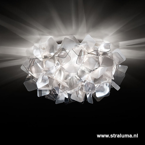 De zachte rookkleur van de elementen zorgen voor een mooi licht. De transparante en semi-transparante elementen zijn speels samengesteld. Het smalle ribbeltje op de semi-transparante elementen zorgt voor extra diepte werking en breekt het licht op een prachtige manier. Deze design plafonnière kan ook prima dienst doen als wandlamp.