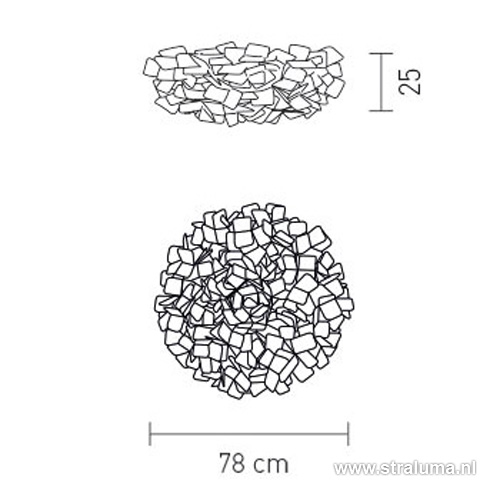 – hoogte van de lamp 25 cm – doorsnede van de lamp 78 cm – gewicht lamp: 3,8 kg – plafond/wand bevestiging: Ø 37,5 cm – geschikt vood LED, dus energiezuinig