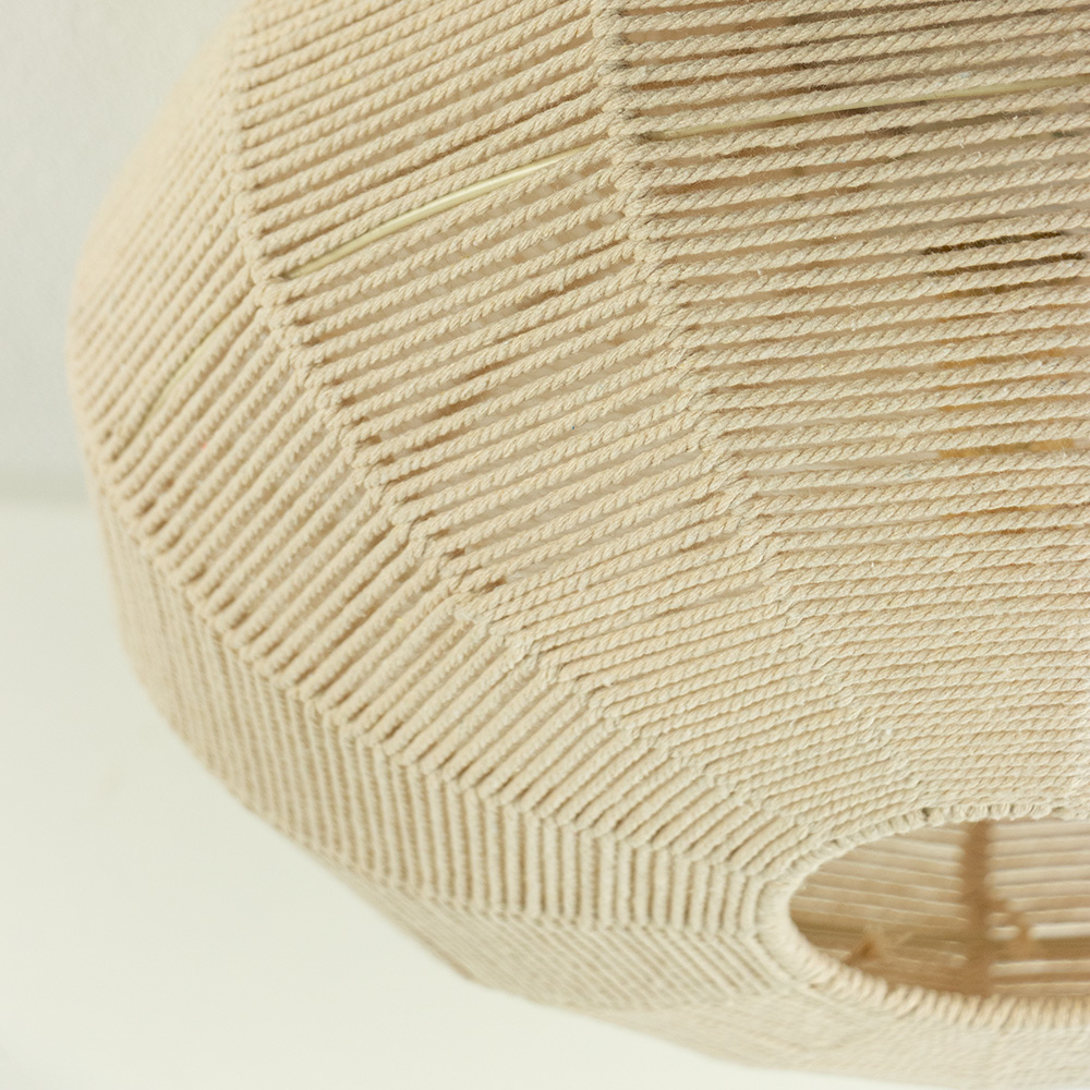 Specificaties: • Afmetingen: Ø40 x 24,5 cm (dxh) • Plafondbevestiging: Ø12 x 2,5 cm • Kap: Ø40 x 22 cm • Materiaal: Touw en metaal • Kleur: Zand/Crème • Gewicht: 1 kg • Fitting: 1x E27 (lichtbron niet inbegrepen) • Dimbaar: Ja, met een geschikte dimbare lichtbron en dimmer (niet inbegrepen).