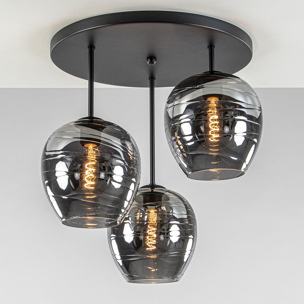 Wat een unieke plafondlamp, modern met een zeer luxe uitstraling. De 3-lichts zwarte plafondlamp is voorzien van een smoke glas met een spiegelend effect. Zodra de lamp is uitgeschakeld spiegeld het glas z’n omgeving, schakelt u de lamp in, dan wordt het glas smoke, oftewel donker transparant. Dit effect zorgt voor de luxe uitstraling van de lamp en wordt versterkt door de vorm van het glas. De glazen kappen zijn ieder op een andere hoogte geplaatst wat een speels effect geeft. Het smoke glas hangt aan een grote ronde plafondplaat van 45 cm doorsnede. De grote plafondlamp leent zich prima voor een ruimte met een hoog plafond, de woonkamer of slaapkamer. De luxe 3-lichts plafondlamp wordt geleverd zonder lichtbron (3x E27).