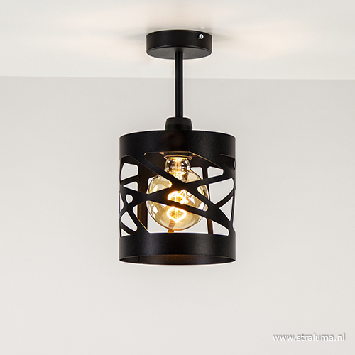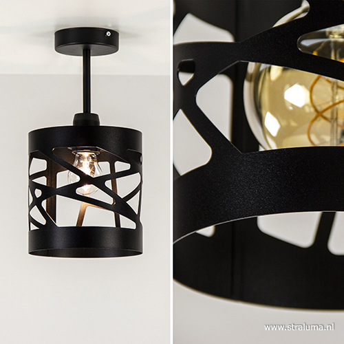 Ideaal in een kleine ruimte deze kleine plafondlamp. De zwarte plafondlamp is weer eens iets heel anders dan de gewone plafonnière zoals we deze kennen. Het strakke ontwerp wordt doorbroken door de speelse uitsnijdingen in de kap. Dit zorgt er ook voor dat de plafondlamp mooi past in een modern of Scandinavisch interieur. De metalen kap hangt aan een metalen stang en wordt aan het plafond bevestigd met een zwarte ronde bevestiging. Super leuk in een kleine hal of het toilet.