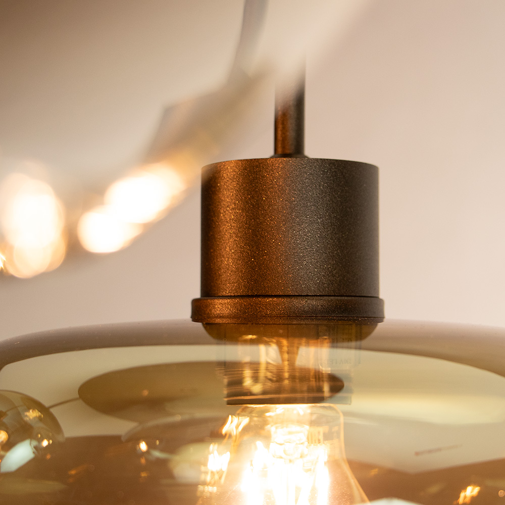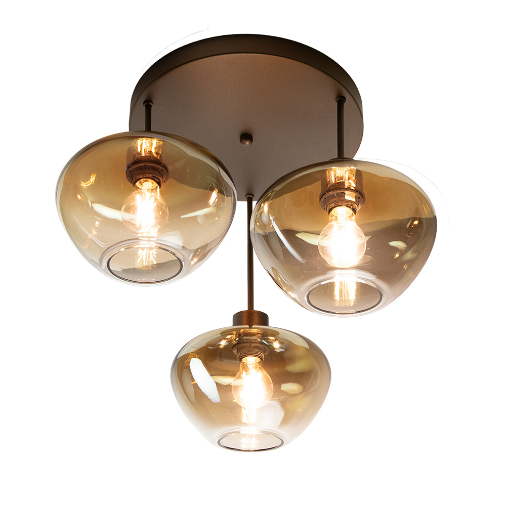 Plafondlamp Genua is met haar luxe, elegante uitstraling niet te missen in uw interieur. De amber smoke glazen kappen van de 3-lichts plafondlamp zijn op een speelse manier trapsgewijs over de ronde, donker bronze plafondbevestiging verdeeld en hebben een prachtige overloop van amber- naar helder glas. De kappen hangen aan 3 metalen stangen die de illusie geven van een pendel lamp. Erg mooi in verschillende woonstijlen.