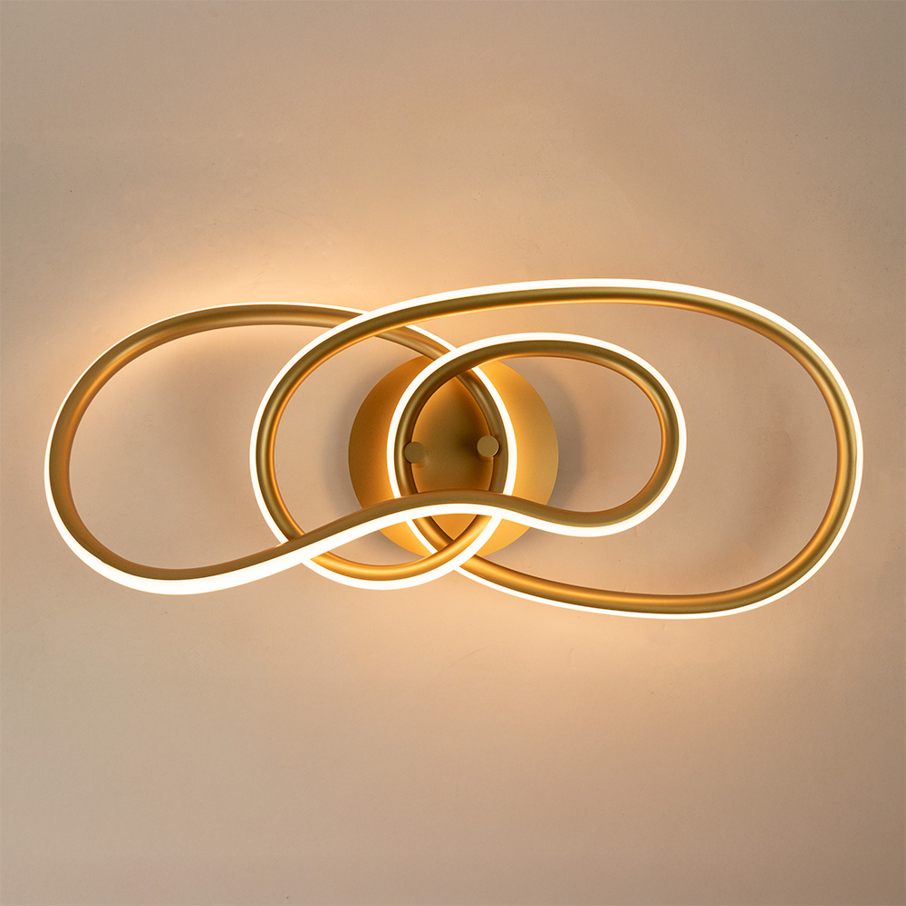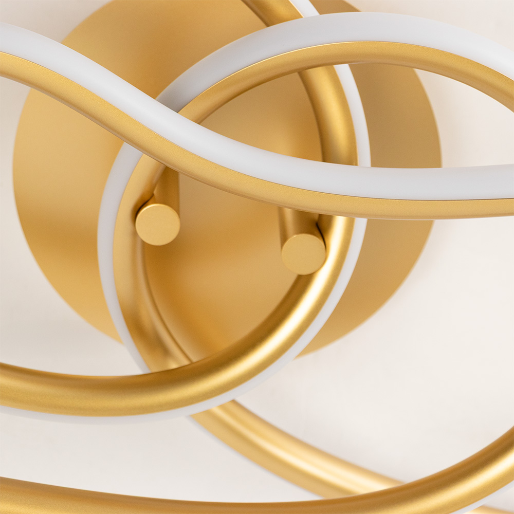 Deze plafondlamp is een echte blikvanger en brengt sfeer en stijl in elk interieur. Het ontwerp bestaat uit elegante, goudkleurige lijnen die sierlijk in elkaar verweven zijn en een dynamisch, vloeiend patroon vormen. De ingebouwde LED-verlichting zorgt voor een warme, uitnodigende uitstraling, terwijl het goudkleurige armatuur een luxe en eigentijdse uitstraling toevoegt aan elke kamer. Dankzij het verfijnde en subtiele design creëert deze plafondlamp een unieke ambiance en een stijlvolle uitstraling in uw woonruimte. Perfect geschikt voor zowel moderne als klassieke interieurs, biedt deze lamp niet alleen praktische verlichting, maar ook een opvallend decoratief element aan het plafond.