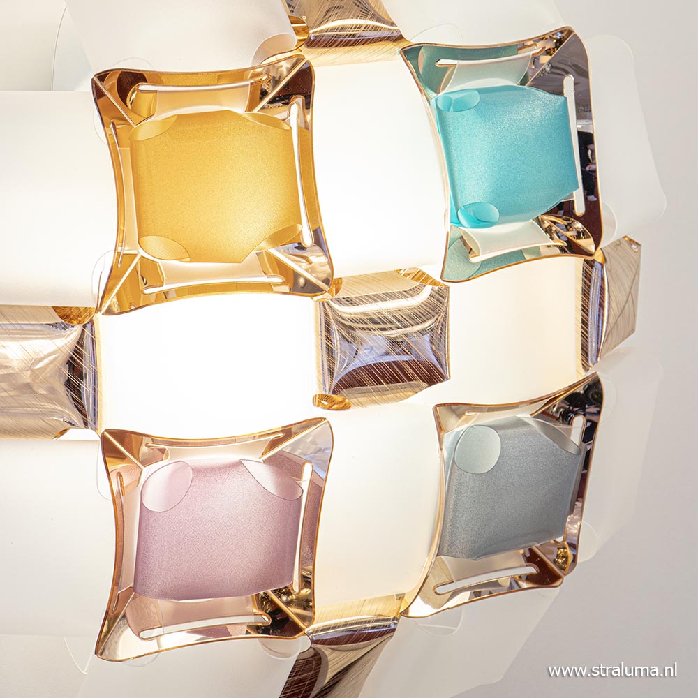 Design, luxe, en glamour in één. De design lamp is geïnspireerd op juwelen uit de haute couture en doet dan ook denken aan edelstenen en diamanten. De geometrische kap bestaat uit losse elementen die samen de kap vormen en zijn gemaakt van opalflex en lentiflex, beide materialen die zorgen voor de extra luxe uitstraling. De kap wordt met een magnetisch ophangsysteem aan de bevestiging opgehangen en de lamp is geschikt voor zowel het plafond als de muur. Waar deze Italiaanse designlamp ook komt te hangen, het geeft meteen sfeer, luxe en vooral glamour aan het interieur.