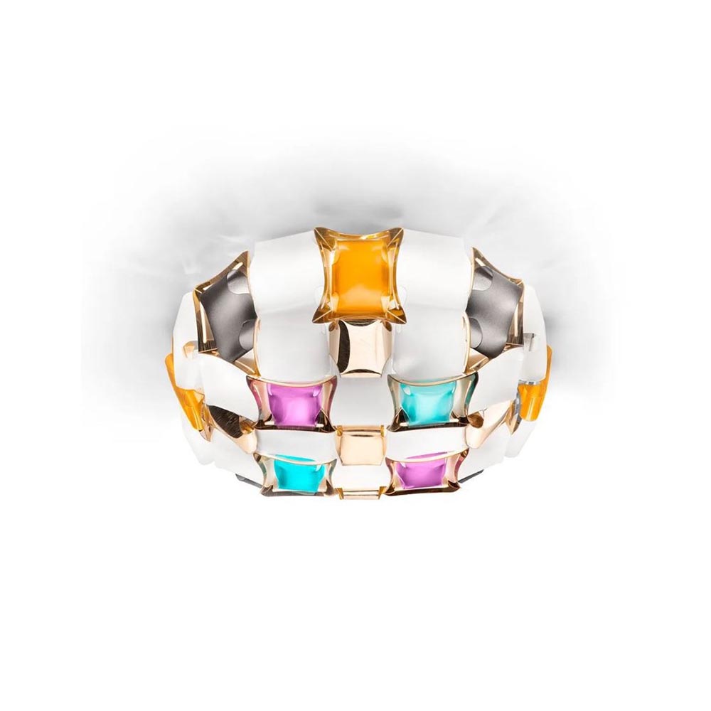 Design van Italiaans komaf. Deze luxe plafondlamp van ‘Slamp’ is ontworpen door Adriano Rachele en straalt een en al luxe en glamour uit. De plafonnière is geïnspireerd op juwelen uit de haute couture. De plafondlamp doet dan ook meteen denken aan edelstenen en diamanten. De geometrische kap bestaat uit losse elementen die samen de kap vormen en zijn gemaakt van opalflex en lentiflex, beide materialen die zorgen voor de extra luxe uitstraling. De kap wordt met een magnetisch ophangsysteem aan de bevestiging opgehangen en de lamp is geschikt voor zowel het plafond als de muur. Waar deze Italiaanse designlamp ook komt te hangen, het geeft meteen sfeer, luxe en vooral glamour aan het interieur.
