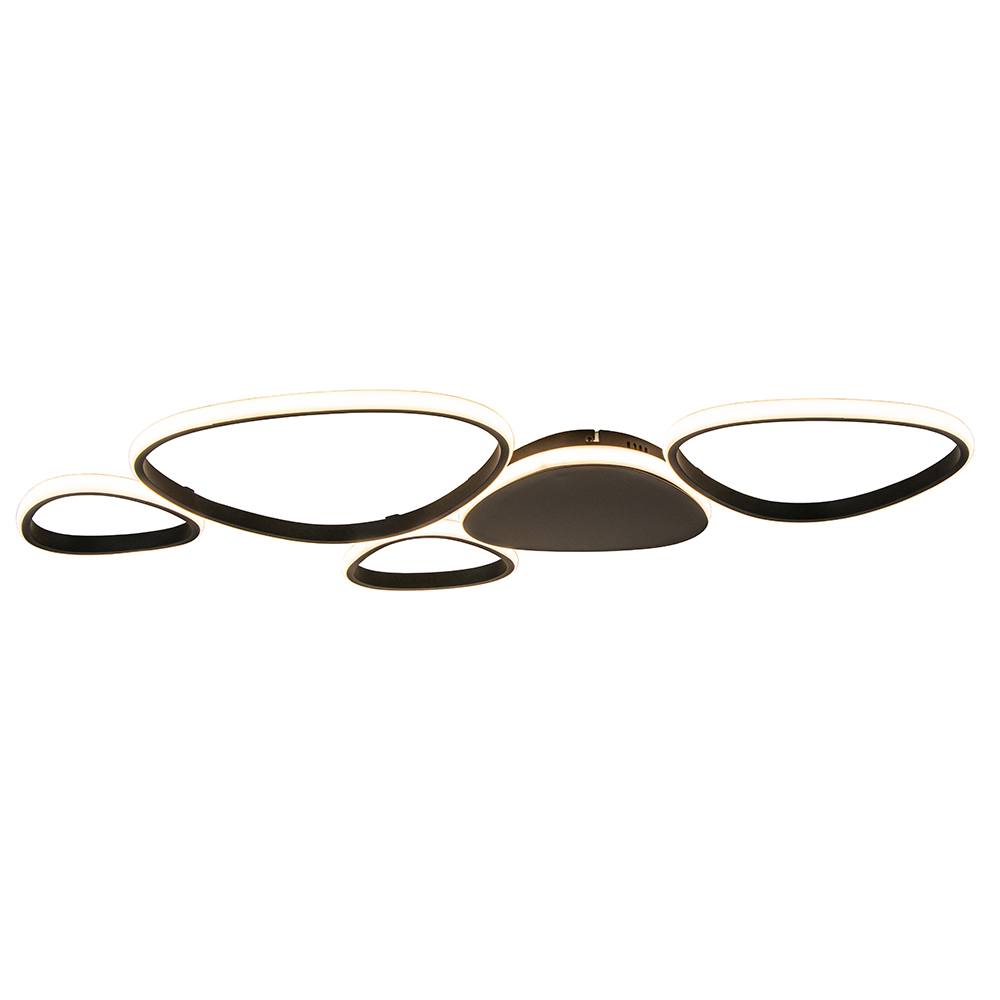 Deze prachtig vormgegeven plafondlamp is een eyecatcher in het interieur. De moderne plafondlamp is voorzien van geïntegreerd LED welke dimbaar is middels een externe dimmer (exclusief). De LED lamp heeft een strak design met een speelse twist. Het armatuur is volledig uitgevoerd in het zwart en is voorzien van meerdere LED strips. Dit zorgt ervoor dat de plafonnière een goede lichtopbrengst geeft en met 2700 Kelvin een sfeervolle warm witte verlichting. Ideaal voor in een hal of slaapkamer.