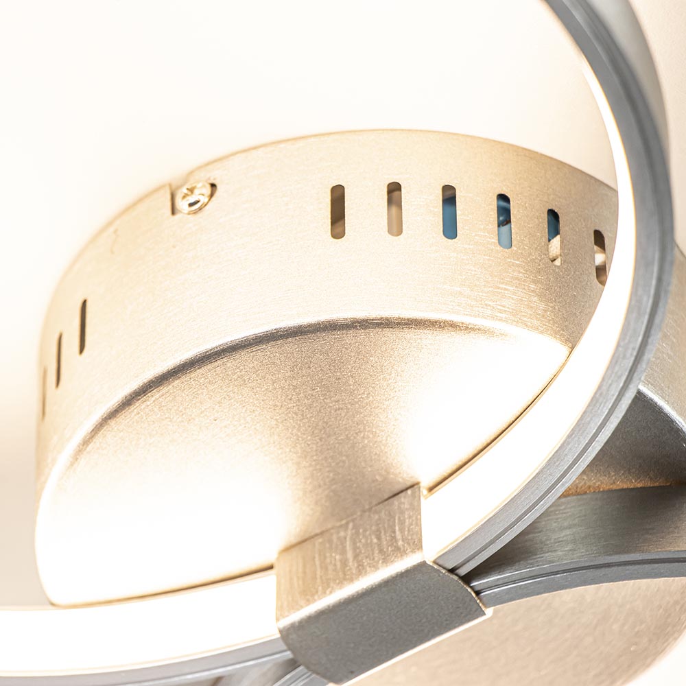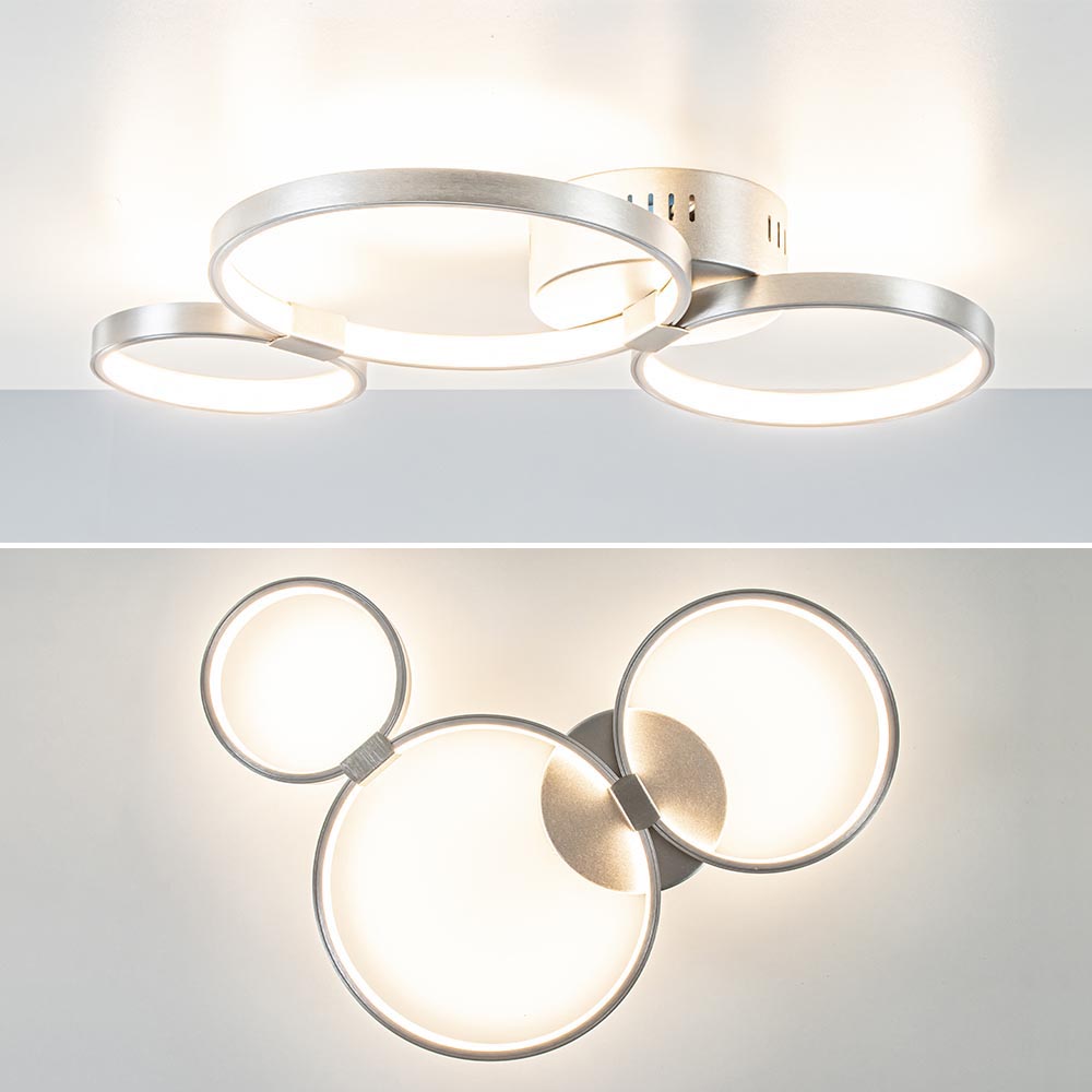 Een leuk design met een moderne techniek. Deze moderne plafondlamp bestaat uit 3 ringen die schuin met elkaar zijn verbonden en daardoor een speelse look krijgt. De nikkel ringen zijn aan de binnenzijde voorzien van een LED strip die met 2700 Kelvin zorgen voor een sfeervolle warm witte verlichting. Het fijne aan deze nikkel plafondlamp is dat deze is voorzien van een 3-standen dim functie. Dit houdt in dat u de plafondlamp met uw gewone wandschakelaar kunt dimmen door deze achter elkaar aan en uit te zetten. De plafondlamp begint op z’n felst en dimt dan per keer dat u de schakelaar overhaald. Zo kunt u gemakkelijk en snel de gewenste sfeer creëren. Ideaal voor in een woonkamer of slaapkamer.