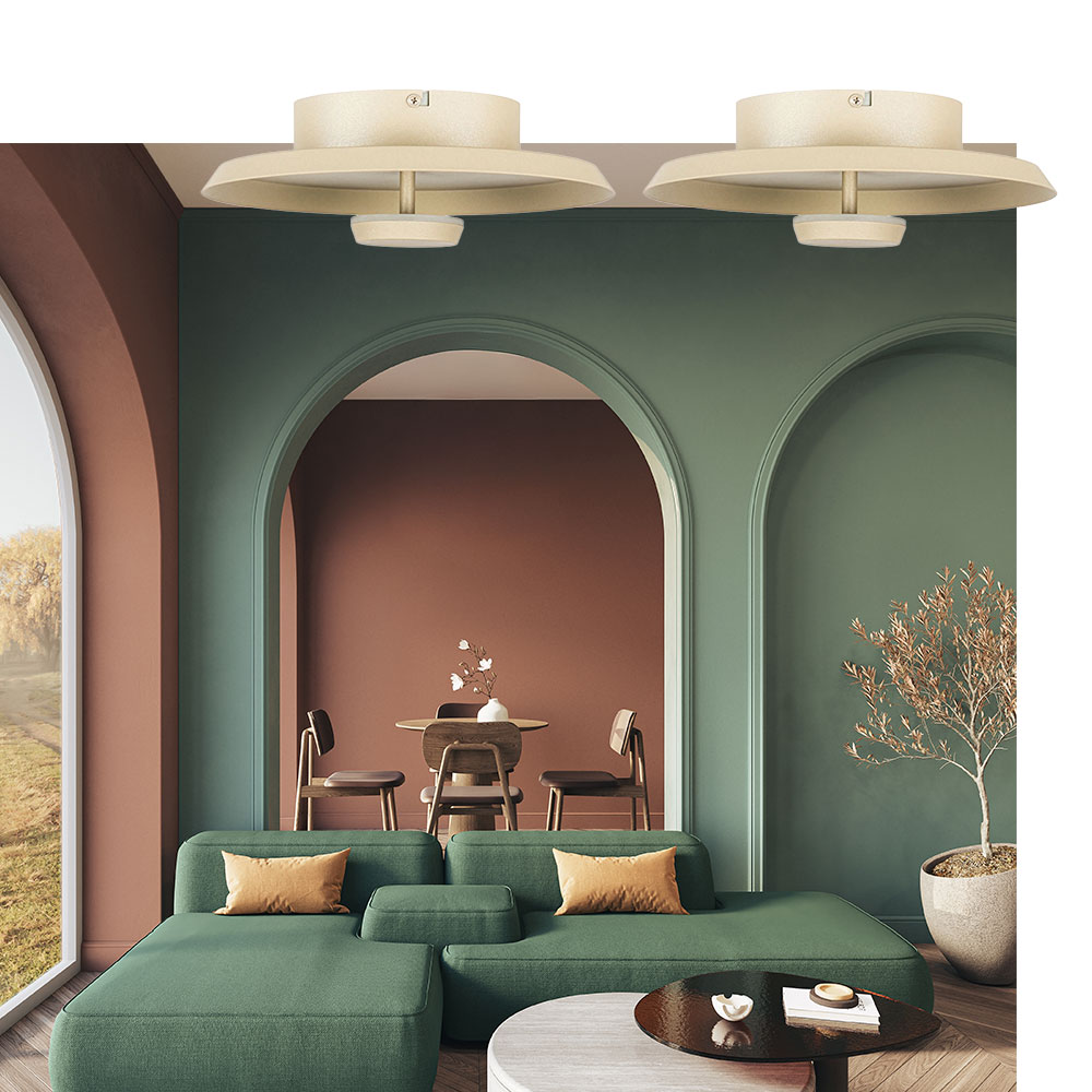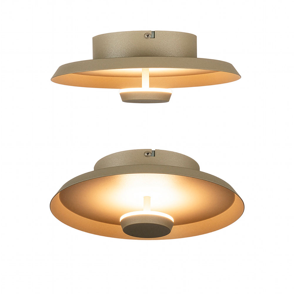 Specificaties: • Merk: Highlight • Serie: Oro • Kleur: Zand • Afmetingen: Ø 25 cm • Afmetingen bevestiging : Ø 14 cm x 4 cm H • Materiaal: Metaal • Lichtbron: Geïntegreerde LED, 8W, 2700K, 720 lumen • Dimbaar: Ja, via externe dimmer (niet inbegrepen)