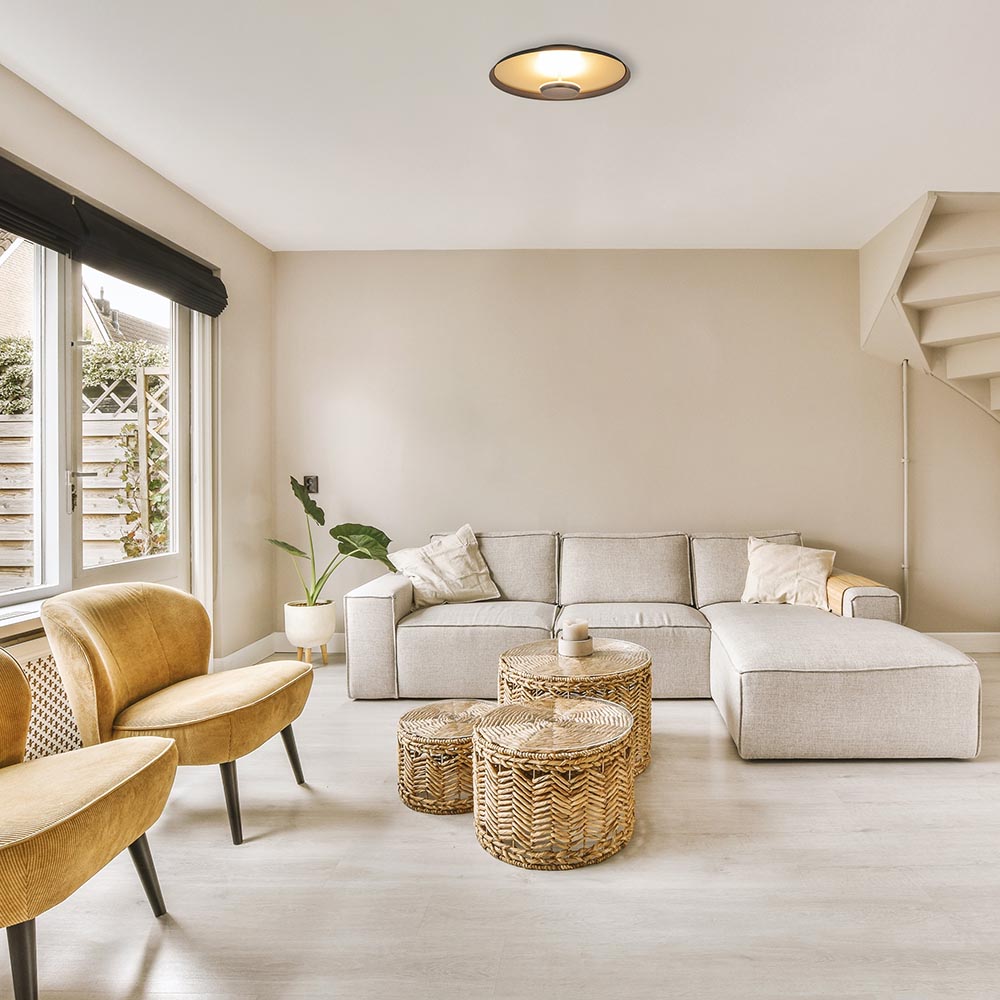 Deze mooie plafondlamp met warme uitstraling is super stoer. De metalen plafondlamp heeft een mat zwarte buitenkant en een gouden binnenkant. Doordat de LED verlichting naar boven schijnt wordt het gereflecteerd door de goudkleurige schaal. De gouden binnenkant heeft de lamp een super warme en sfeervolle uitstraling. Door het lichte metaal is de lamp geschikt voor ieders plafond. Stijlvol, sfeervol en strak, echt een interieur topper.