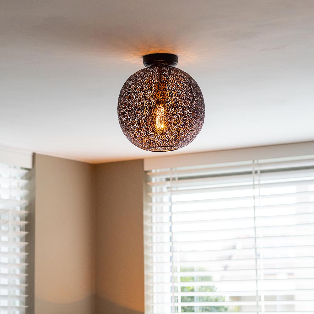 Stoer met een chique uitstraling. Deze moderne plafondlamp doet een beetje denken aan koraal en is gemaakt uit kleine metaaldeeltjes die samen de ronde kap vormen. Het metaal is afgewerkt met een mat zwarte finish aan de buitenzijde en een gouden finish aan de binnenzijde. Het goud zorgt voor een luxe chique uitstraling en creëert tevens een sfeervolle warme gloed. Ook de fitting is afgewerkt in de kleur goud. De zwart gouden bol is bevestigd op een ronde metalen bevestiging. De moderne plafondlamp wordt geleverd zonder lichtbron (E27).