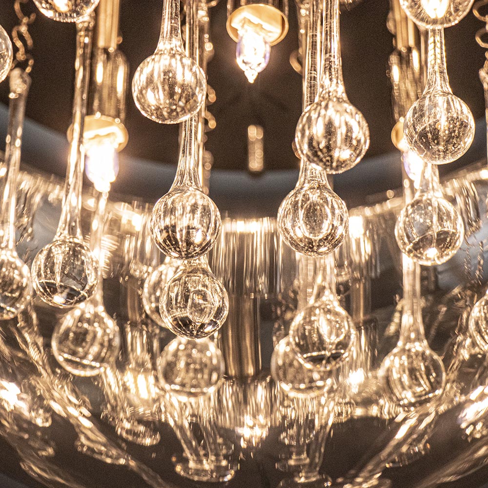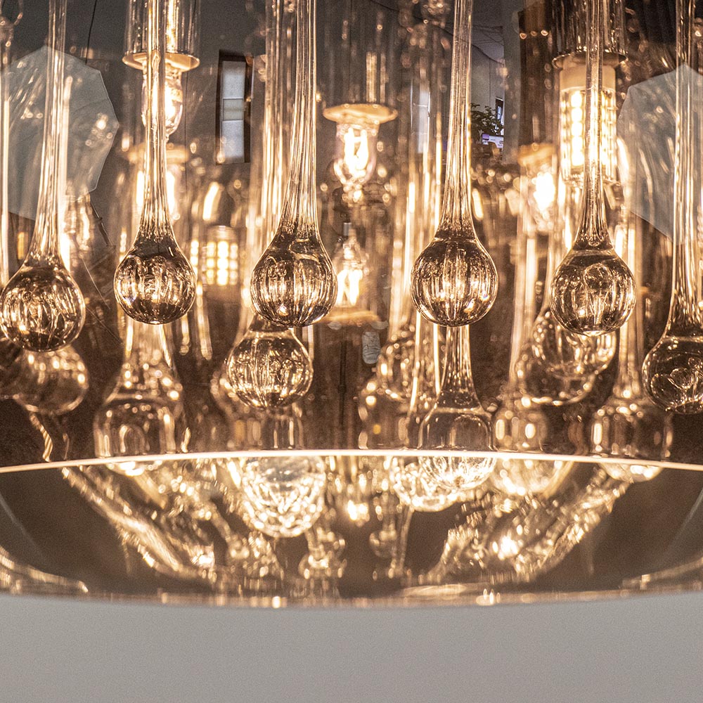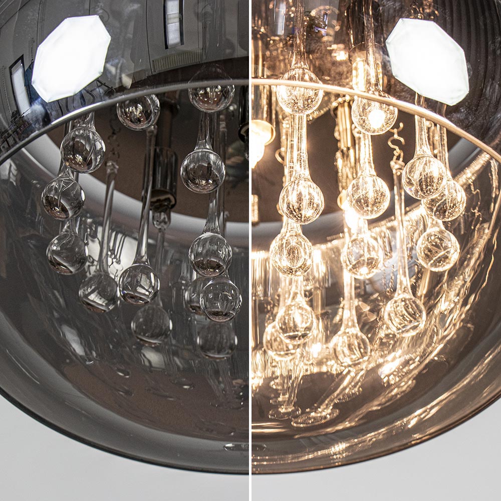 De letterlijk en figuurlijk schitterende plafonnière-plafondlamp Pearl wordt met zijn mond geblazen glazen kap van Ø50 cm nog echt ambachtelijk vervaardigd. De kap is het best te omschrijven als zijnde gemaakt van semi transparant rookglas. Door deze combinatie van spiegeling en transparantie heeft de Pearl een zeer luxueuze en warme uitstraling. De transparante glaspegels aan de binnenzijde van de glazen lampenkap maken het geheel af.