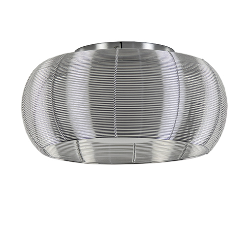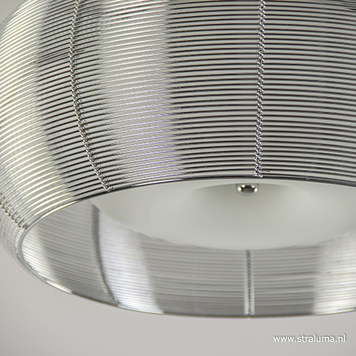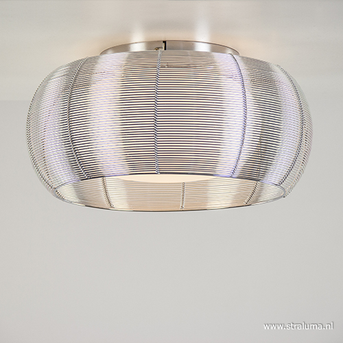 Deze zilveren plafondlamp-plafonnière is een mooie toevoeging aan een modern interieur. De kap is gemaakt van zilveren metaaldraden die rondom zijn ingevlochten op het zilveren frame. De metalen kap is van binnen voorzien van een opaal glazen afwerkkap die ervoor zorgt dat er niet direct in de lichtbron kan worden gekeken. Tevens zorgt deze kap er ook voor dat er een warme en sfeervolle verlichting ontstaat. De plafondlamp wordt met een chromen ronde plafondplaat bevestigd en past door z’n formaat mooi in een keuken, hal, slaapkamer of woonkamer.