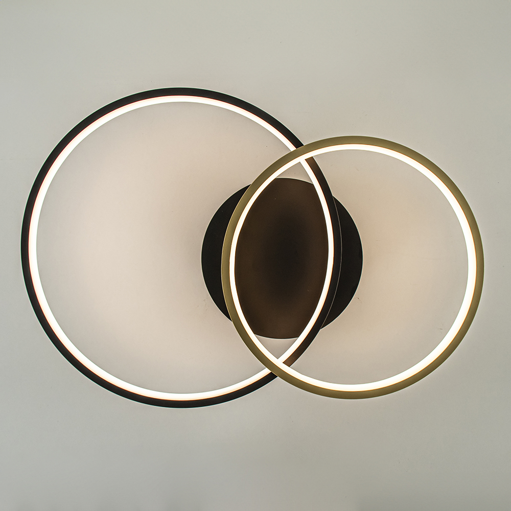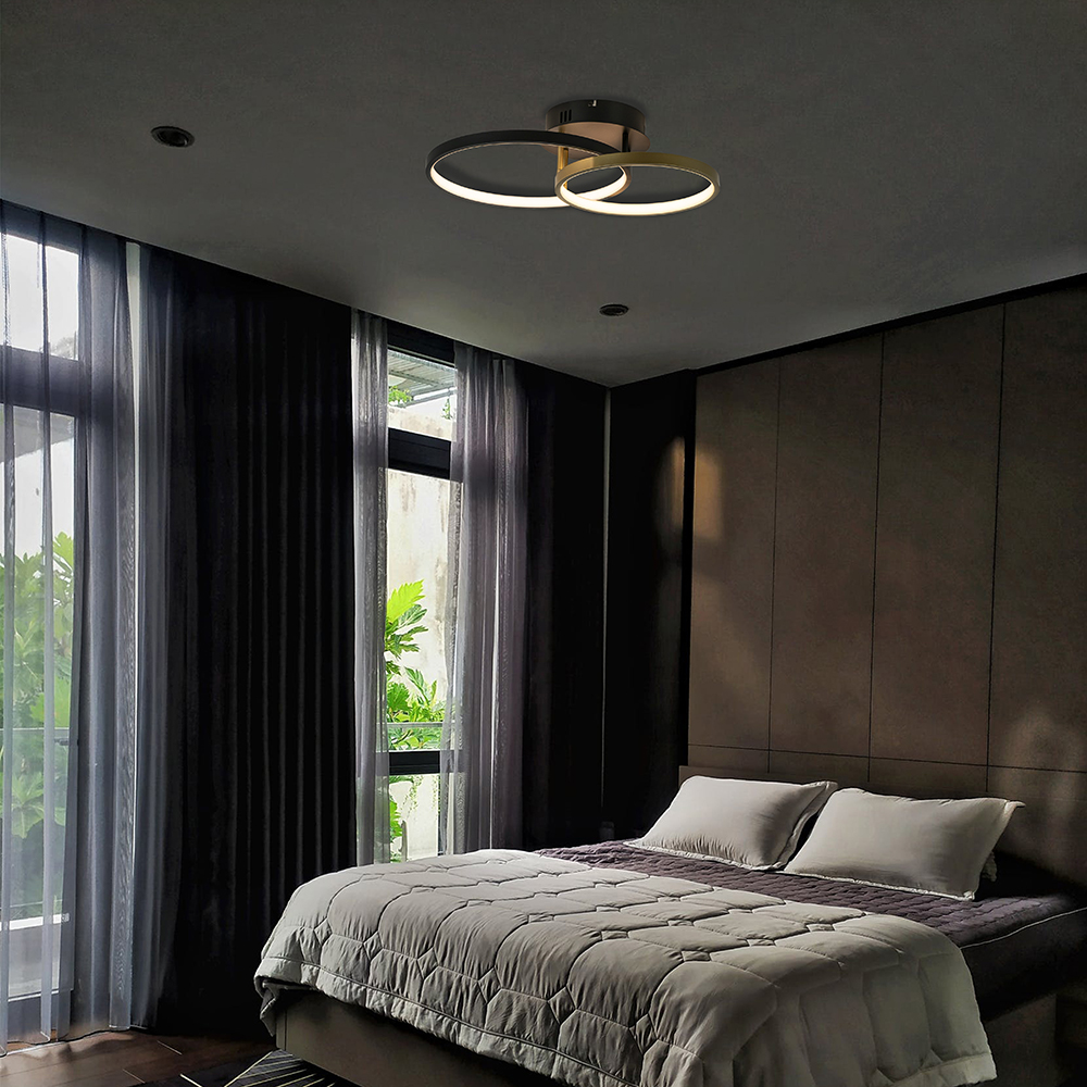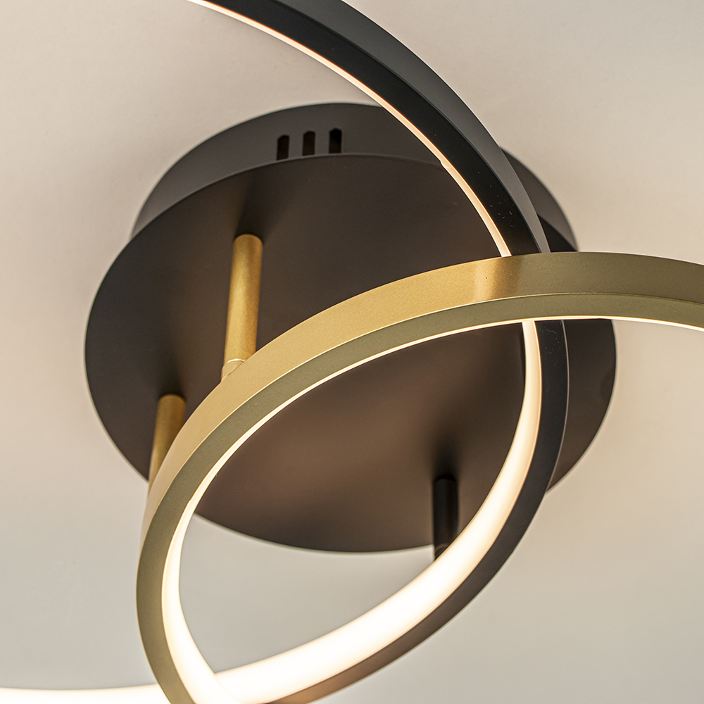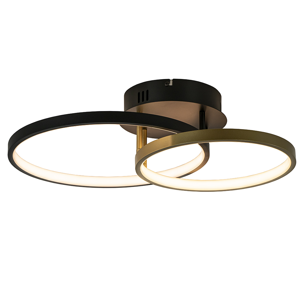 Ideaal voor in de hal of slaapkamer. Deze moderne plafondlamp heeft een strak design en zorgt met 2 LED ringen voor een prima lichtopbrengst. Het armatuur is gemaakt van metaal en uitgevoerd in het zwart met goud. Dit geeft de lamp een trendy look die mooi is te combineren in diverse woonstijlen. De 2 ringen zijn beide voorzien van geïntegreerd LED en geven met 2700 Kelvin een sfeervolle warm witte verlichting. De plafondlamp double rings is dimbaar middels een externe dimmer (exclusief).