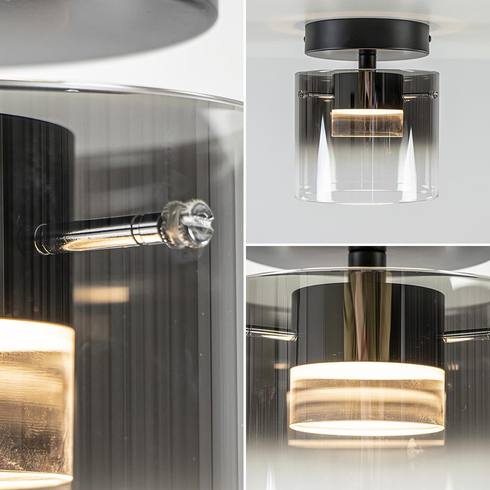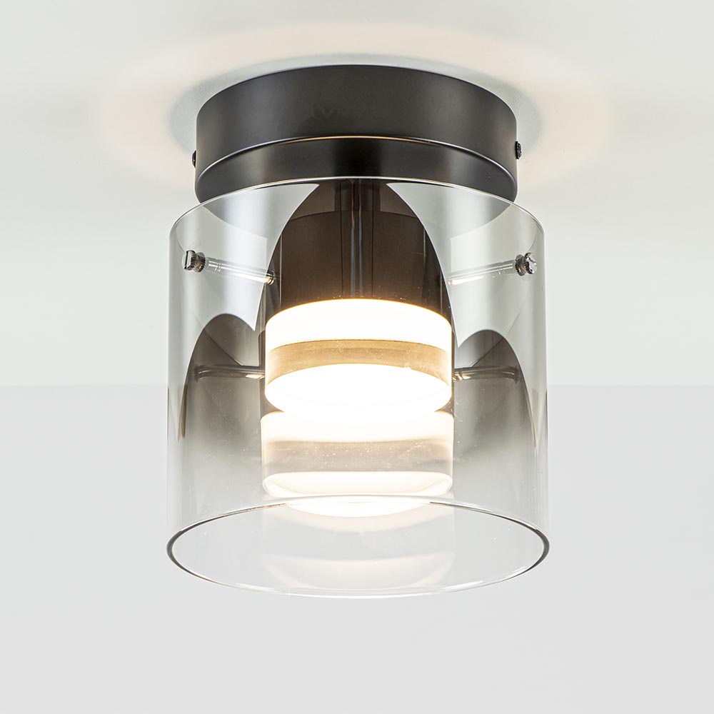 Sfeervol in de hal, elegant in toilet. Deze kleine plafondlamp is op diverse plekken in huis toe te passen. De LED plafondlamp geeft met 2700 Kelvin een fijne warme verlichting en een goede opbrengst van 810 lumen. De LED lamp bestaat uit een metalen bevestiging die is uitgevoerd in het mat zwart, en een glazen cilinder vormige kap welke is voorzien van een speciaal effect. In het glas zit een verloop van titanium/smoke naar helder. Deze overgang geeft de glazen kap een luxe chique uitstraling die mooi kan worden gecombineerd in een strak klassiek, modern of luxe interieur. De cilinder kap wordt op de fitting bevestigd met drie schroefjes. Binnenin het glas bevindt zich de LED module. De plafondlamp is dimbaar met een geschikte LED dimmer (exclusief).