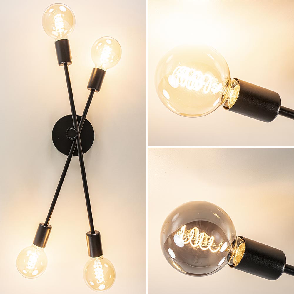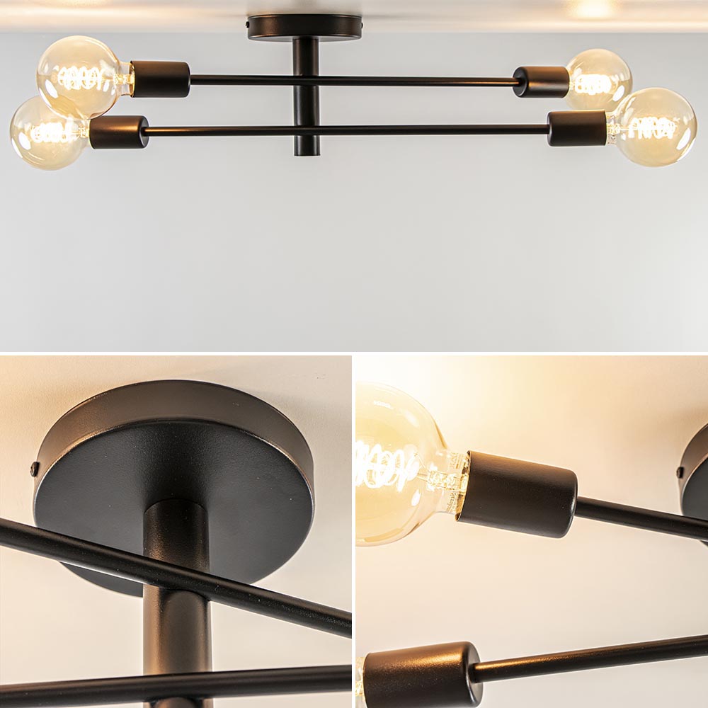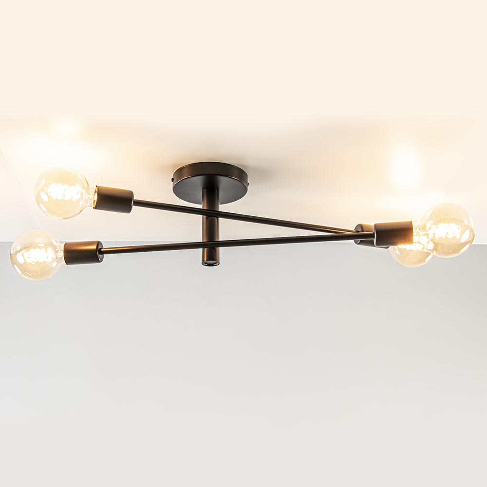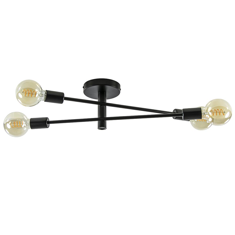 Bent u op zoek naar dé juiste plafondlamp voor dat ene lege plekje aan uw plafond? Wij weten de juiste kandidaat voor u! Deze plafondlamp 4-lichts zwart is multifunctioneel te gebruiken, namelijk als plafondlamp, maar hij is ook geschikt voor aan uw wand! Ook bepaalt u grotendeels de uitstraling van deze zwarte plafondlamp. Waarom vraagt u zich af? De retro plafondlamp 4-lichts zwart wordt geleverd exclusief lichtbronnen, wat betekent dat u de taak krijgt de juiste te kiezen voor uw interieur. U kunt de keuze maken voor lichtbronnen met een goude glans, wat het geheel een warme uitstraling zal geven. Ook kunt u de keuze maken voor bronnen met een smoke glans, wat de plafondlamp een stoere en moderne uitstraling zal geven. De zwarte plafondlamp is dimbaar, maar wordt geleverd exclusief dimmer.