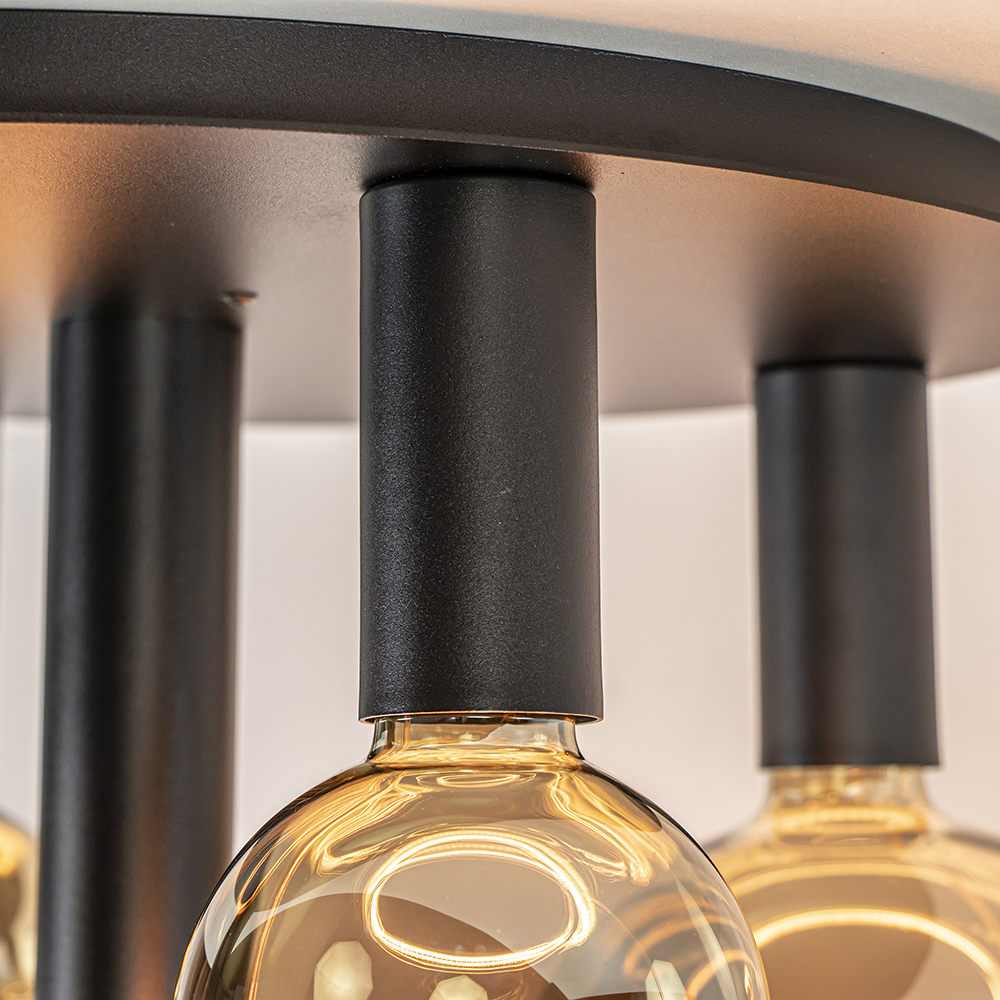 Deze chique design plafondlamp zorgt voor sfeer en stijl in het interieur. De grote plafondlamp heeft een doorsnede van 50 cm en een hoogte van 27,5 cm. Het armatuur is gemaakt van metaal en voorzien van een zwarte finish. De cilinders hebben diverse hoogtes en zijn voorzien van E27 en GU10 fittingen. Dit zorgt dat de lamp zowel diffuus als direct licht verspreid. De lichtbronnnen zijn exclusief en zijn naar wens te kiezen. In de foto is gebruik gemaakt van Floating LED wat de plafondlamp een extra luxe uitstraling geeft. De ronde plafondlamp is dimbaar middels een externe dimmer (exclusief)