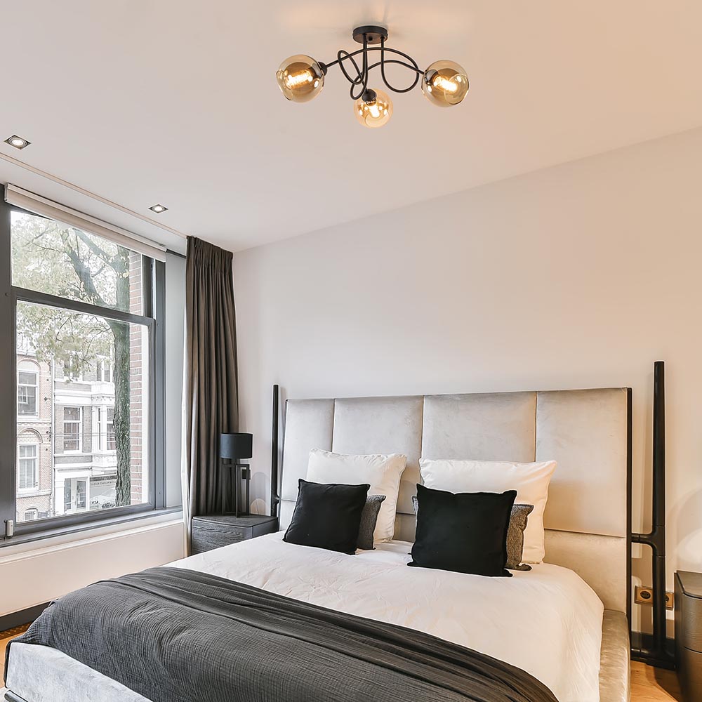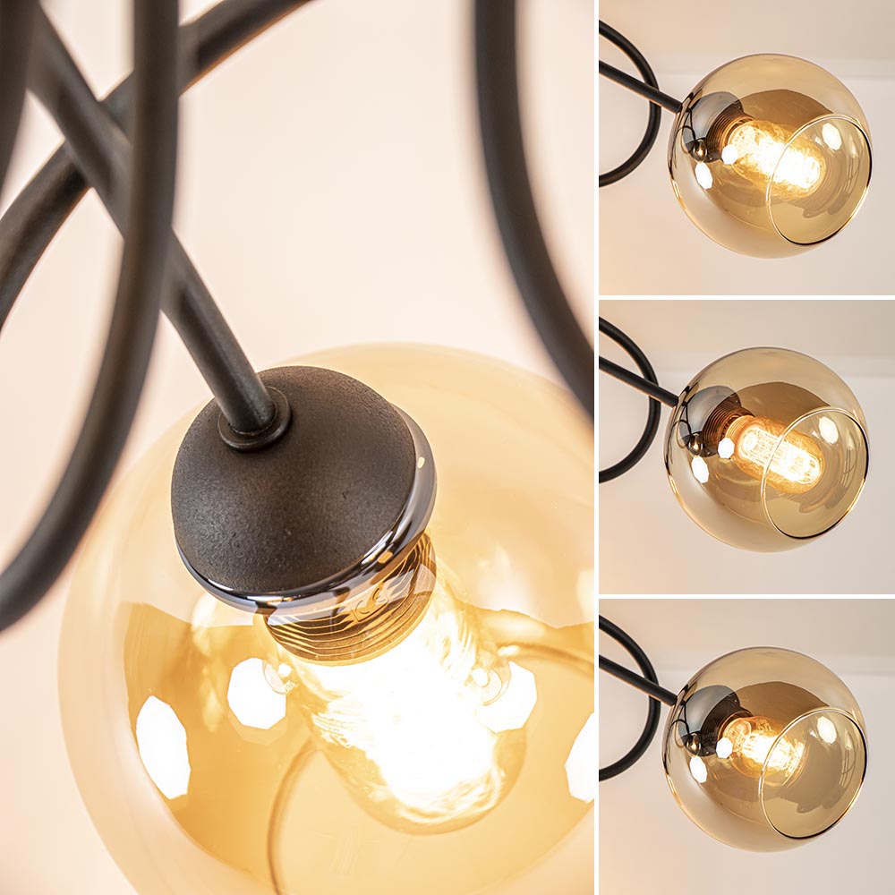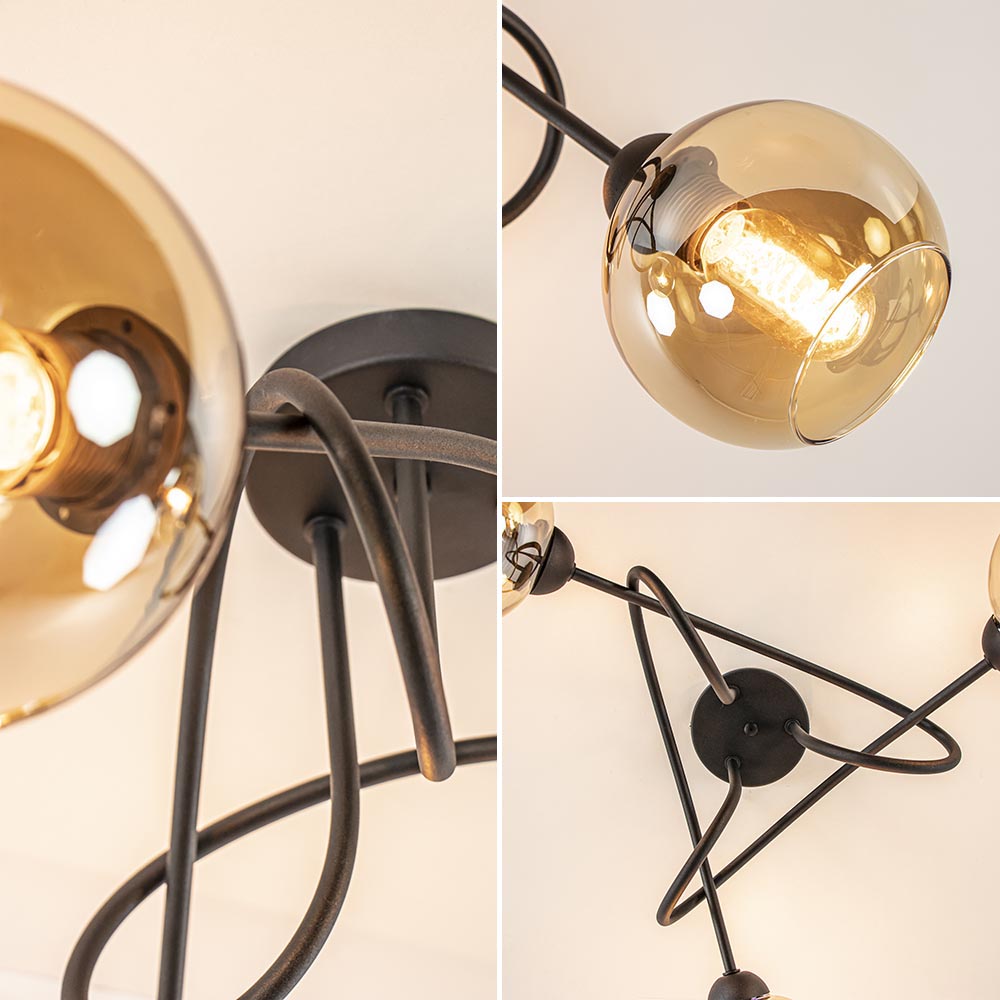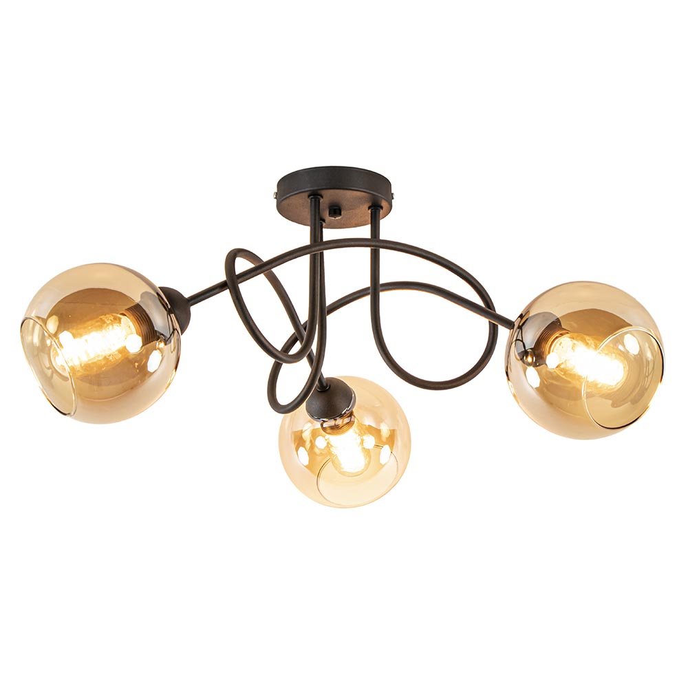 Sierlijke trendy 3-lichts plafondlamp. Deze mat zwarte plafondlamp met amber kleurig glas is een echte eyecatcher. Het amber kleurige glas geeft de lamp een mooie warme gloed. Het fraaie armatuur loopt krullend in elkaar over. De lamp is leuk voor in een slaapkamer of een hal en matcht mooi in een klassiek of retro interieur. De sierlijke lamp wordt exclusief lichtbronnen geleverd en is dimbaar middels een externe dimmer (exclusief).