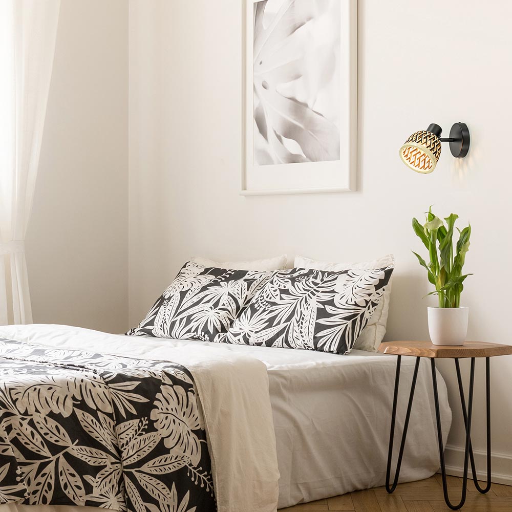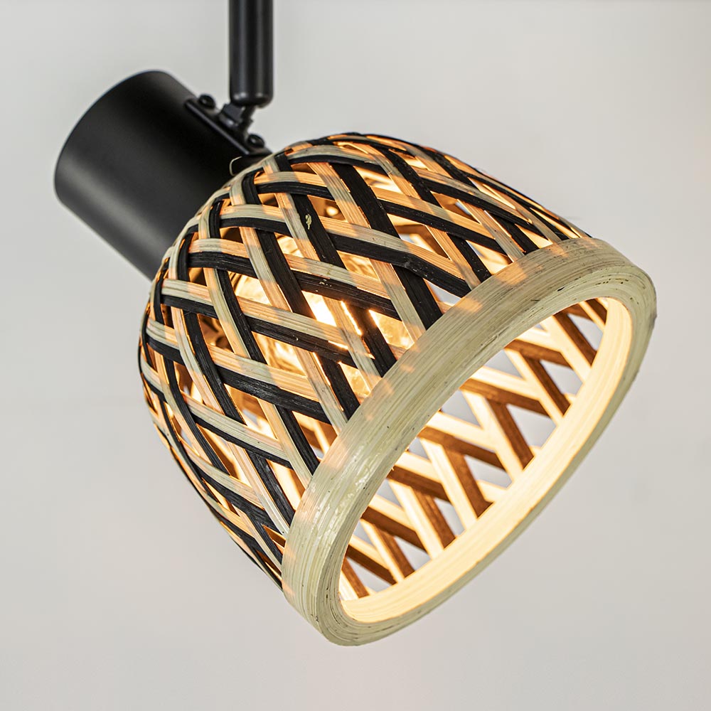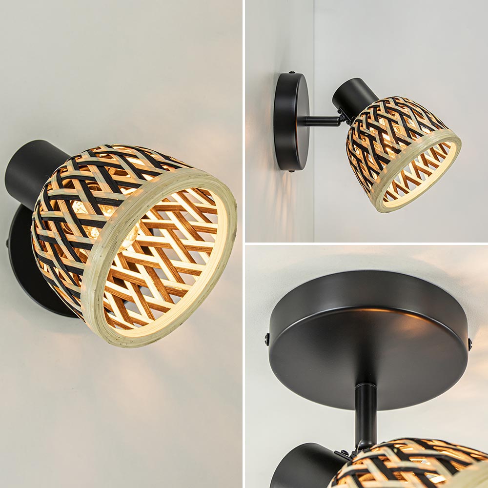 Super leuk als plafondlamp in een hal of toilet, maar ook te gebruiken als wandlamp. Deze kleine lamp is een leuke toevoeging aan het interieur. De plafondlamp heeft een mat zwart metalen armatuur dat is gecombineerd met een bamboe kap in de kleur naturel en zwart. De combinatie maakt de plafond/wandlamp prima geschikt voor woonstijlen als landelijk, botanisch of Scandinavisch. Het kapje is naar wens te verstellen door deze te draaien en/of te kantelen. De wand/plafondlamp wordt geleverd zonder lichtbron.