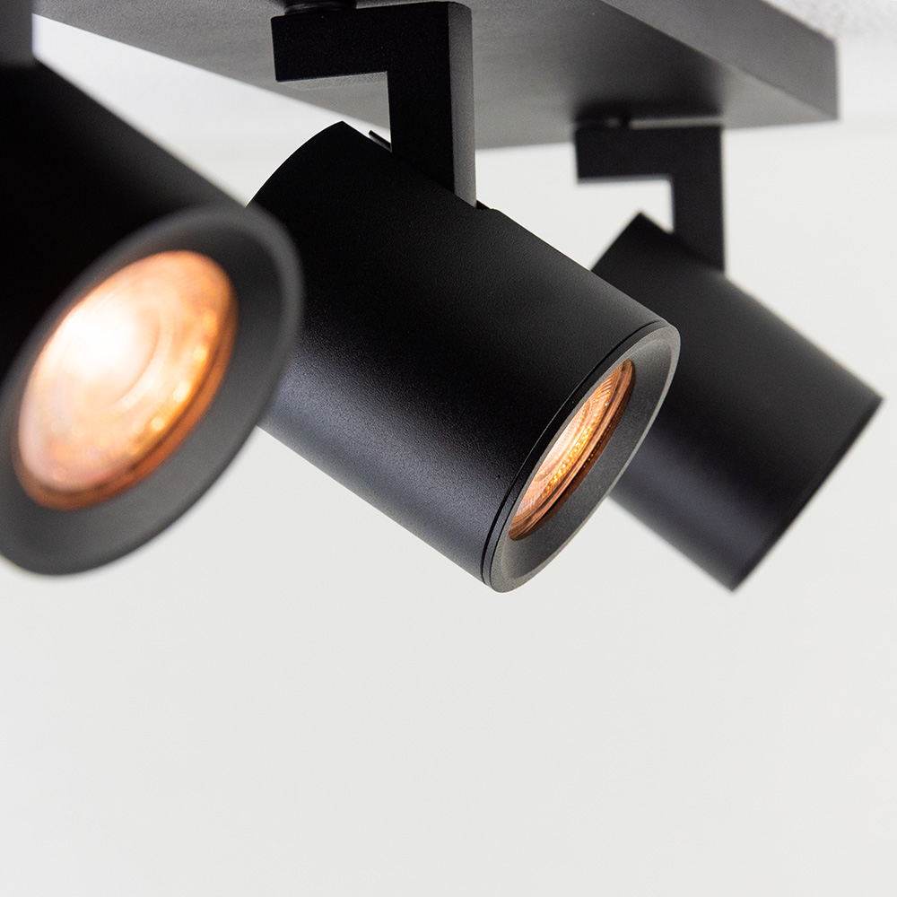 De spots zijn draaibaar en kantelbaar, zodat je altijd het juiste lichtaccent kunt creëren. De robuuste metalen behuizing in combinatie met de matzwarte afwerking zorgt voor een luxe, tijdloze uitstraling.