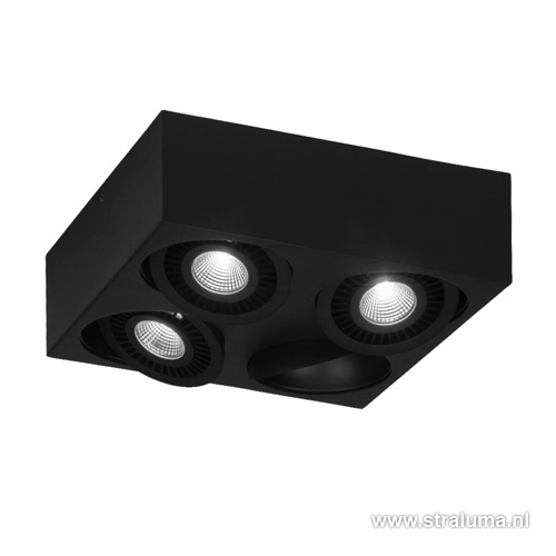Prachtige vierkante design opbouwspot. Deze 4-lichts plafondspot is multifuctioneel en zal goed staan in een modern en strak interieur, maar ook in een mooi gerenoveerde boederij. De spot is gemaakt van staal en in mat zwart gespoten. Een kleur die op dit moment weer helemaal trendy is. Doordat de vier spots afzonderlijk van elkaar te richten en draaien zijn, is deze zwarte plafondlamp op vele plaatsen in huis inzetbaar.