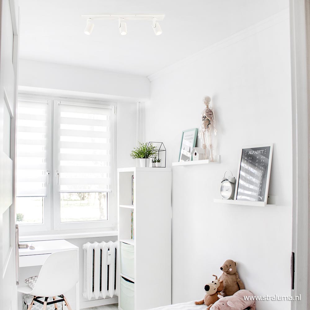Deze moderne opbouwspot heeft een strak en minimalistisch design. De drie spots zijn gemakkelijk te verstellen door ze te draaien en te kantelen. Ideaal voor in een hal of smalle kamer. De spots zijn voorzien van een ring die eraf gedraaid kan worden zodat u de lichtbron kunt plaatsen. De metalen spots zijn bevestigd op een L-vormig pootje die weer is bevestigd op de metalen plafondbalk. De opbouwspot is volledig afgewerkt in mat wit wat een luxe design look geeft. De 3-lichts plafondspot wordt geleverd zonder lichtbronnen (3x GU10).