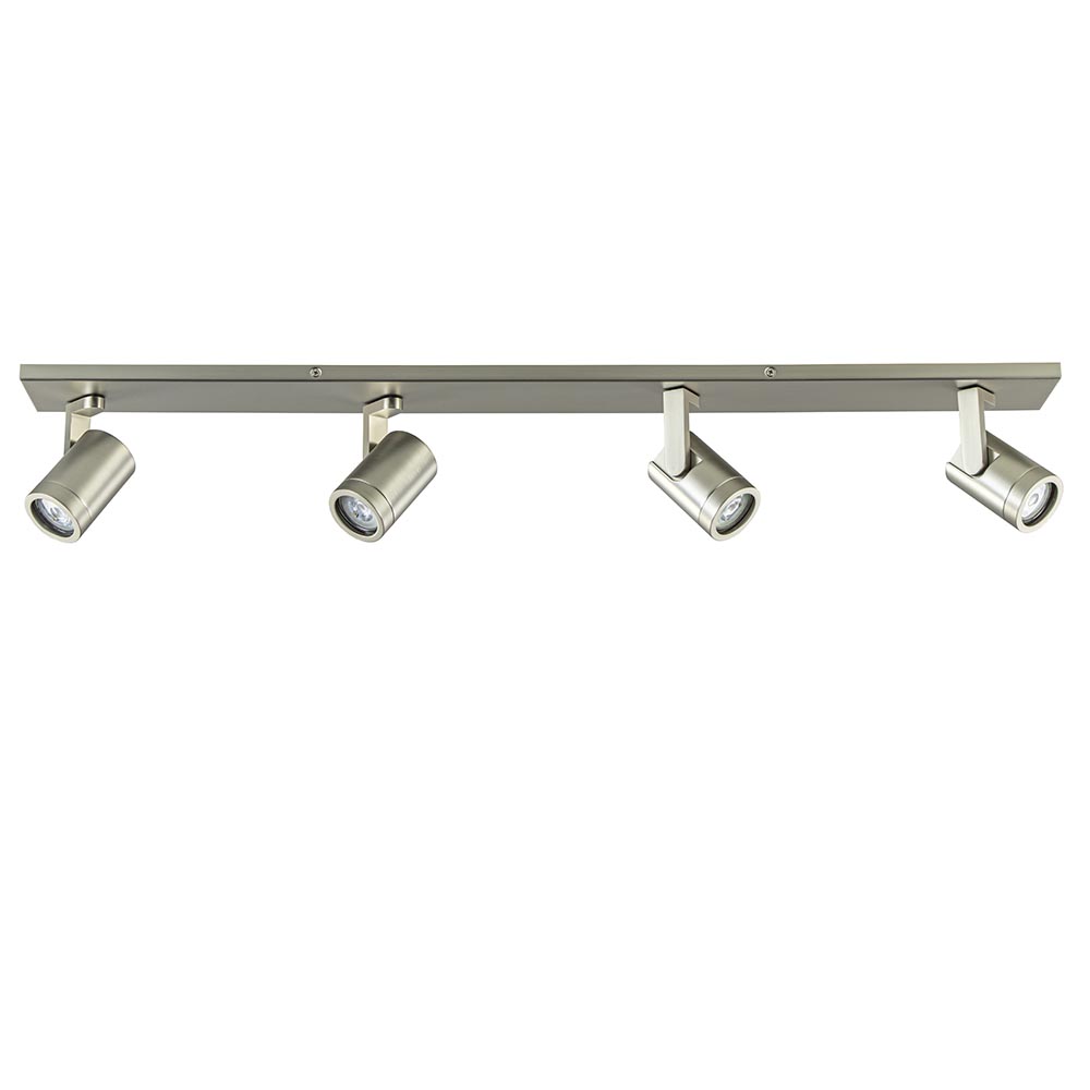 – hoogte: 15 cm – spots: Ø6×9 cm – bevestiging: 91,5×9,5×1,5 cm – metaal, mat nikkel – verstelbare spots – exclusief lichtbron (4x GU10) – dimbaar (exclusief)