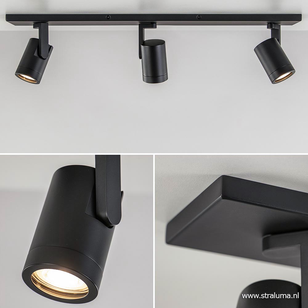 Deze moderne opbouwspot heeft een strak en minimalistisch design. De drie spots zijn gemakkelijk te verstellen door ze te draaien en te kantelen. Ideaal voor in een hal of smalle kamer. De spots zijn voorzien van een ring die eraf gedraaid kan worden zodat u de lichtbron kunt plaatsen. De metalen spots zijn bevestigd op een L-vormig pootje die weer is bevestigd op de metalen plafondbalk. De opbouwspot is volledig afgewerkt in mat zwart wat een luxe design look geeft. De 3-lichts plafondspot wordt geleverd zonder lichtbronnen (3x GU10).