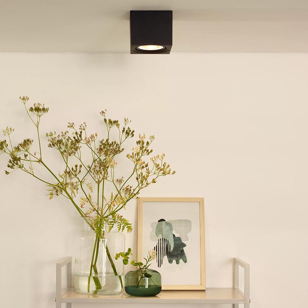 Een ideale plafondspot met hoog sfeergehalte. De kubus opbouwspot is klein, maar groots in effect. De aluminium spot heeft een strak design en is voorzien van een dim to warm functie. Dit houdt in dat wanneer u de spot dimt, deze zowel in kleurtemperatuur als intensiteit dimt. Hier is wel een geschikte dimmer (exclusief) voor nodig. De spot heeft een intensiteit van 820 lumen en een kleurbereik tussen de 2200 en 3000 Kelvin. De LED spot (GU10) is inclusief en heeft een stralingshoek van 40°. Door het kleine formaat is deze zwarte opbouwspot ideaal voor ruimtes met een laag plafond en kan bijvoorbeeld in een toilet worden opgehangen, of met meerdere in een hal, keuken of slaapkamer.