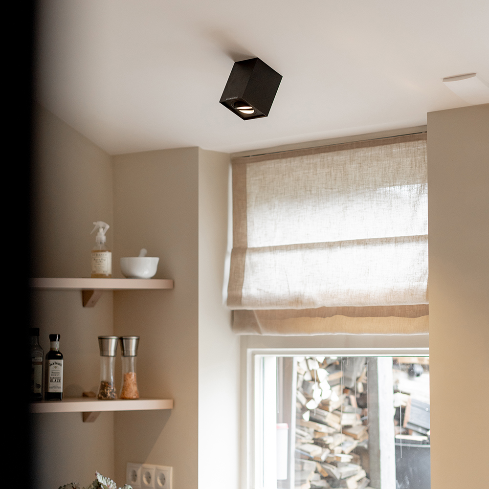 Deze strakke vierkante plafondspot past perfect in een modern interieur. De zwarte spot kan dienen als mooi accentlicht maar kan ook werken als spotlicht om bijvoorbeeld een schilderij of kunstobject uit te lichten. Het vierkante design geeft de spot een strakke en geometrische look. Perfect dus in een modern of zelfs scandinavisch interieur. Het spotje is verstelbaar zodat deze altijd de gewenste kant op kan belichten.