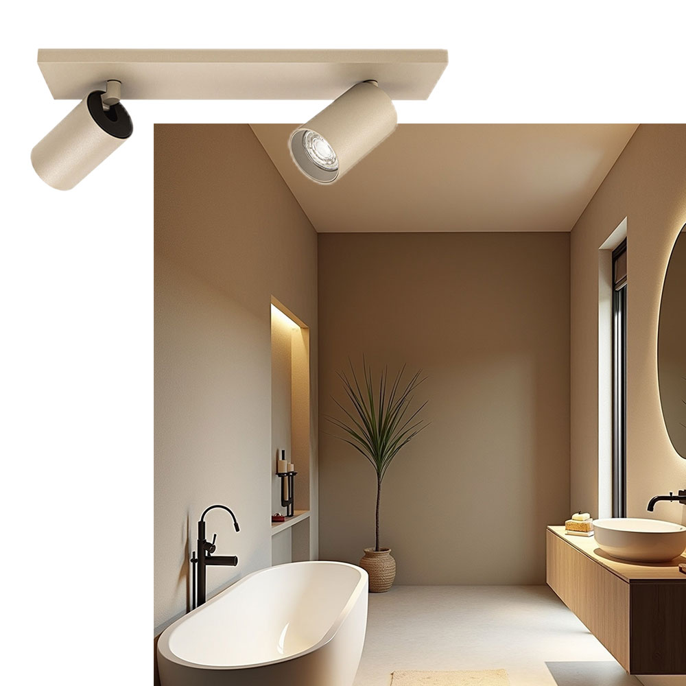 Specificaties: • Serie: Mila • Kleur: Zand • Afmetingen: Bevestiging L 40 × B 9,5 × H 1,5 cm | Kapje H 11 × Ø6 cm | Totale hoogte 12,5 cm • Materiaal: Metaal • Lichtpunten: 2 • Fitting: GU10 (lichtbronnen niet inbegrepen) • Kantelbaar: Ja (richtbare spots) • Dimbaar: Ja, afhankelijk van gekozen lichtbron en externe dimmer