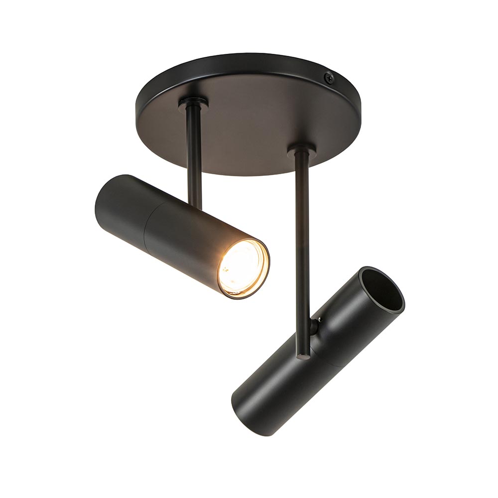 Ideaal voor in de hal, slaapkamer of woonkamer. Deze ronde 2-lichts opbouwspot heeft een strak design en is voorzien van smalle cilinder-vormige spots. Deze zijn te verstellen door ze te draaien en/of te kantelen. Ideaal om de ruimte goed uit te lichten. De moderne opbouwspot is gemaakt van metaal en uitgevoerd in het mat zwart. De cilinder kan worden opengedraaid zodat de lichtbron gemakkelijk kan worden geplaatst.