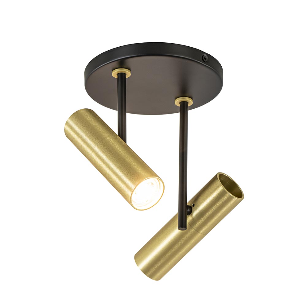 Ideaal voor in de hal, slaapkamer of woonkamer. Deze ronde 2-lichts opbouwspot heeft een strak design en is voorzien van smalle cilinder-vormige spots. Deze zijn te verstellen door ze te draaien en/of te kantelen. Ideaal om de ruimte goed uit te lichten. De moderne opbouwspot is gemaakt van metaal en uitgevoerd in het mat zwart met brass goud. De cilinder kan worden opengedraaid zodat de lichtbron gemakkelijk kan worden geplaatst.
