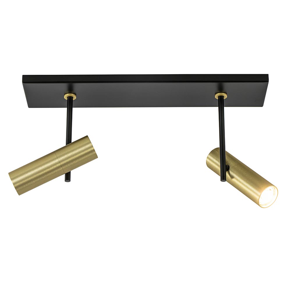 Strak van design en functioneel in gebruik. Deze 2-lichts opbouwspot is een perfecte aanvulling voor een hal, slaapkamer of overloop. De 2-lichts plafondlamp is voorzien van smalle cilinder-vormige spots die naar wens zijn te verstellen door deze gemakkelijk te draaien en/of kantelen. De spots zijn gemonteerd op een balk van 40 cm lang, beide gemaakt van metaal en uitgevoerd in het zwart met brass goud. De lichtbron kan gemakkelijk worden geplaatst door de cilinders open te draaien.