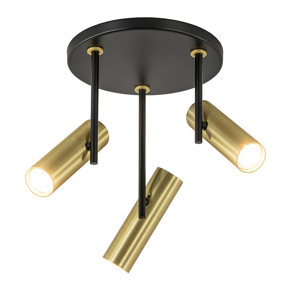 Ideaal voor in de hal, slaapkamer of woonkamer. Deze ronde 3-lichts opbouwspot heeft een strak design en is voorzien van smalle cilinder-vormige spots. Deze zijn te verstellen door ze te draaien en/of te kantelen. Ideaal om de ruimte goed uit te lichten. De moderne opbouwspot is gemaakt van metaal en uitgevoerd in het mat zwart met brass goud. De cilinder kan worden opengedraaid zodat de lichtbron gemakkelijk kan worden geplaatst.