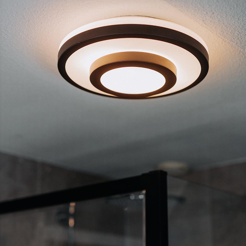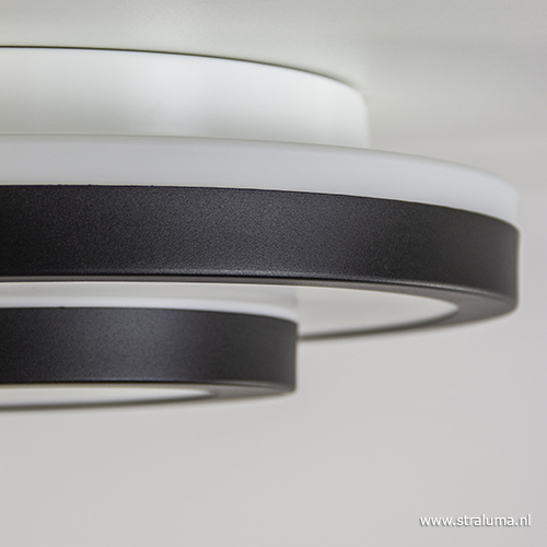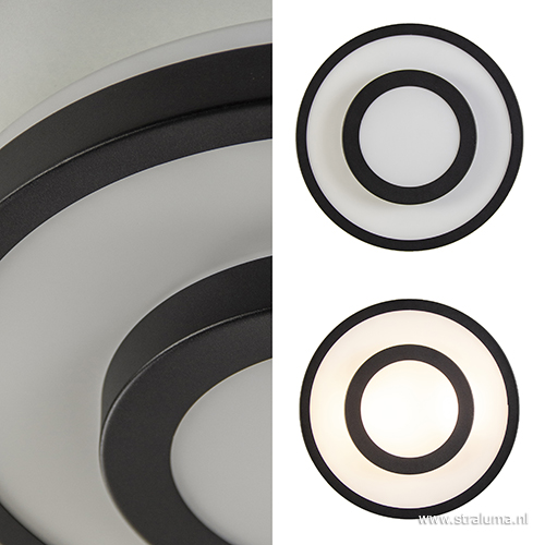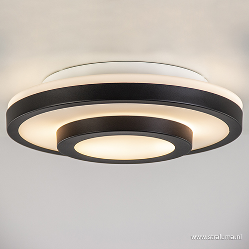 Het model van een klassieke plafonnière, maar dan in een modern jasje. Deze plafondlamp is voorzien van twee lagen waar opaal glas in zit verwerkt. Dit laat zachte en sfeervolle verlichting door. De kap draait gemakkelijk van de bevestiging af zodat de lamp kan worden aangesloten en de lichtbron kan worden geplaatst. De mat zwarte plafondlamp is conform IP44, zodat deze perfect past in een badkamer. Daarnaast past de lamp vanwege z’n formaat ook mooi in een kleinere ruimte als een toilet, hal of overloop.