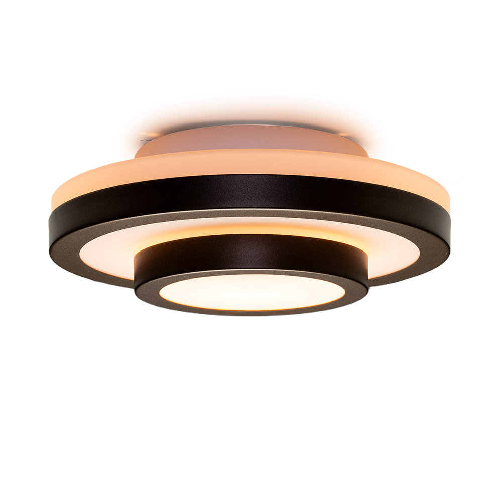 Groot – Warm bruin • Afmetingen totaal: Ø 35 cm × H 10 cm • Lichtpunten: 2× E27 • Lichtbronnen: Exclusief • IP-waarde: IP44 • Materiaal: Metaal en opaalglas