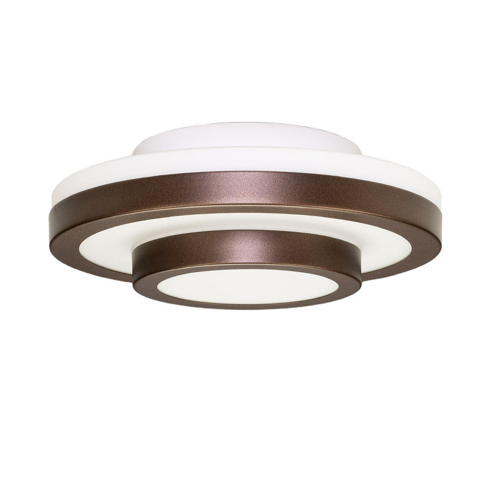 Klein – Warm Bruin • Afmetingen totaal: Ø 26 cm × H 9 cm • Lichtpunten: 1× E27 • Lichtbron: Exclusief • IP-waarde: IP44 • Materiaal: Metaal en opaalglas