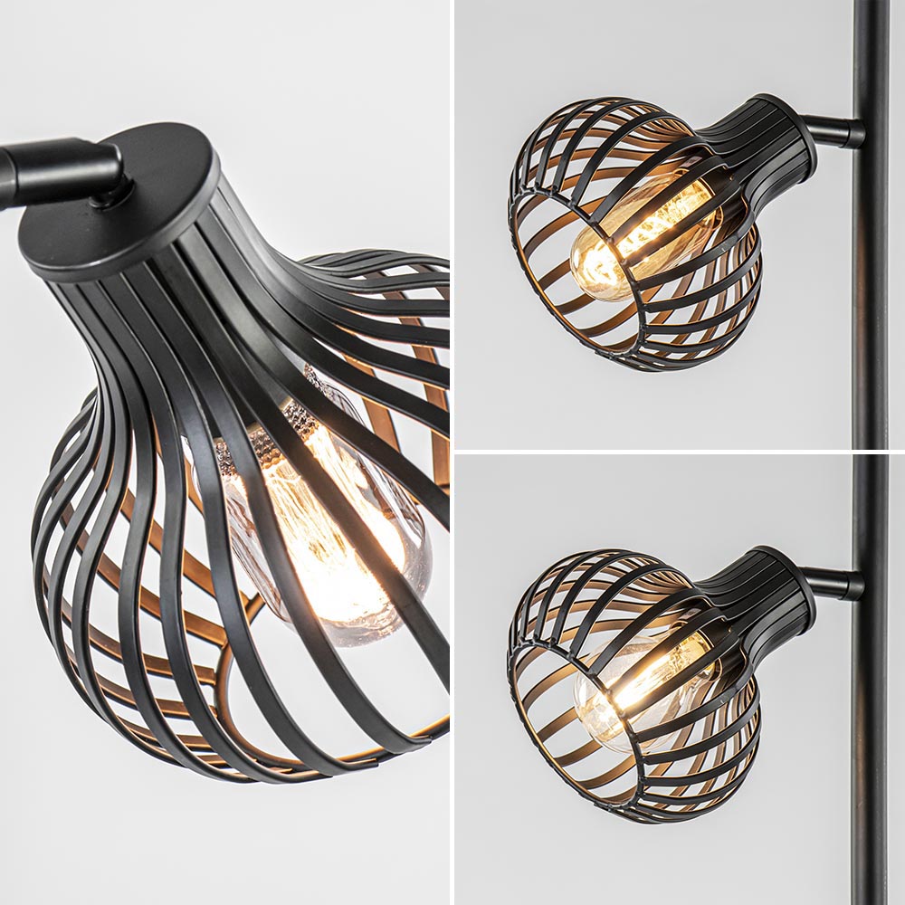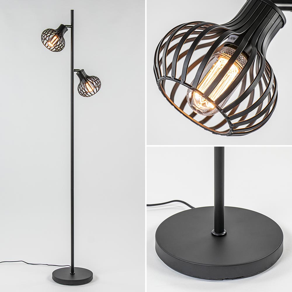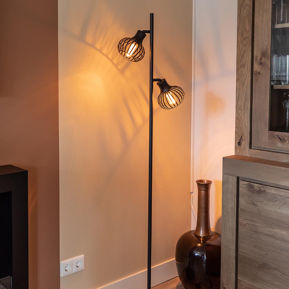 Scandinavisch, modern, landelijk of industrieel, deze vloerlamp past bij allemaal. De staande lamp is gemaakt van metaal en voorzien van een mat zwarte finish. Het zwarte armatuur wordt ondersteund door een stevige ronde voet welke is voorzien van een zwart snoer met een lengte van 225 cm en een voetschakelaar op 80 cm van de voet. De vloerlamp heeft twee kleine draadkappen welke zijn te verstellen door deze te kantelen. De kapjes kunnen niet draaien! De kleine draadkappen zijn een sfeervolle toevoeging aan het interieur en met diverse lichtbronnen te combineren zoals ook in de foto’s zichtbaar is.