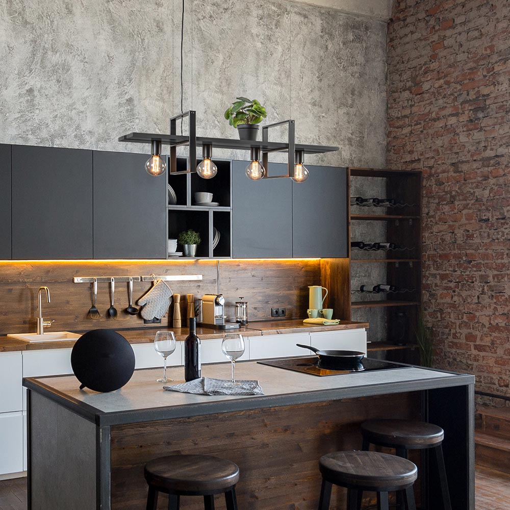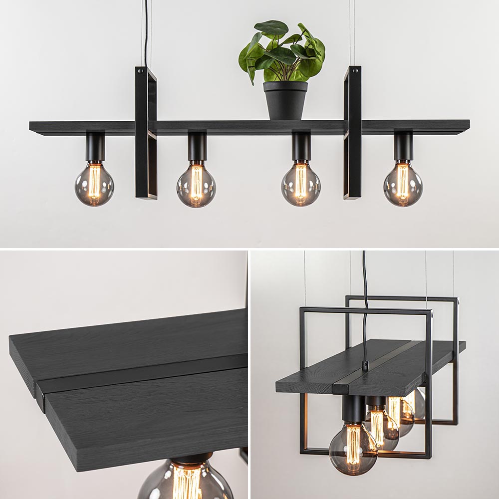 Homepagina / Lampen / Eettafellampen / 4-Lichts hanglamp zwart met zwarte houten planken
