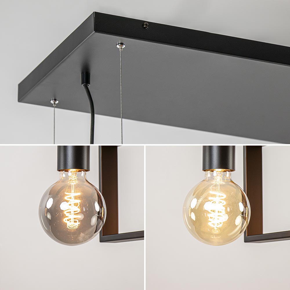 Perfect voor boven een kookeiland of eettafel. De langwerpige hanglamp met frame zorgt voor zowel sfeer als extra decoratie. De hanglamp is namelijk voorzien van twee houten planken waar u leuk een plantje of decoratie op kunt zetten. De planken worden los op het frame gelegd dus het is aan te raden om niet al te zware dingen erop te zetten. Het frame is gemaakt van metaal en uitgevoerd in het mat zwart. De combinatie van het zwart en hout maakt de lamp geschikt voor diverse woonstijlen. Het frame is aan de onderzijde voorzien van vier E27 fittingen en hangt aan vier staaldraden waarmee u de hoogte gemakkelijk kunt verstellen. De grote metalen bevestiging maakt de lamp helemaal af.