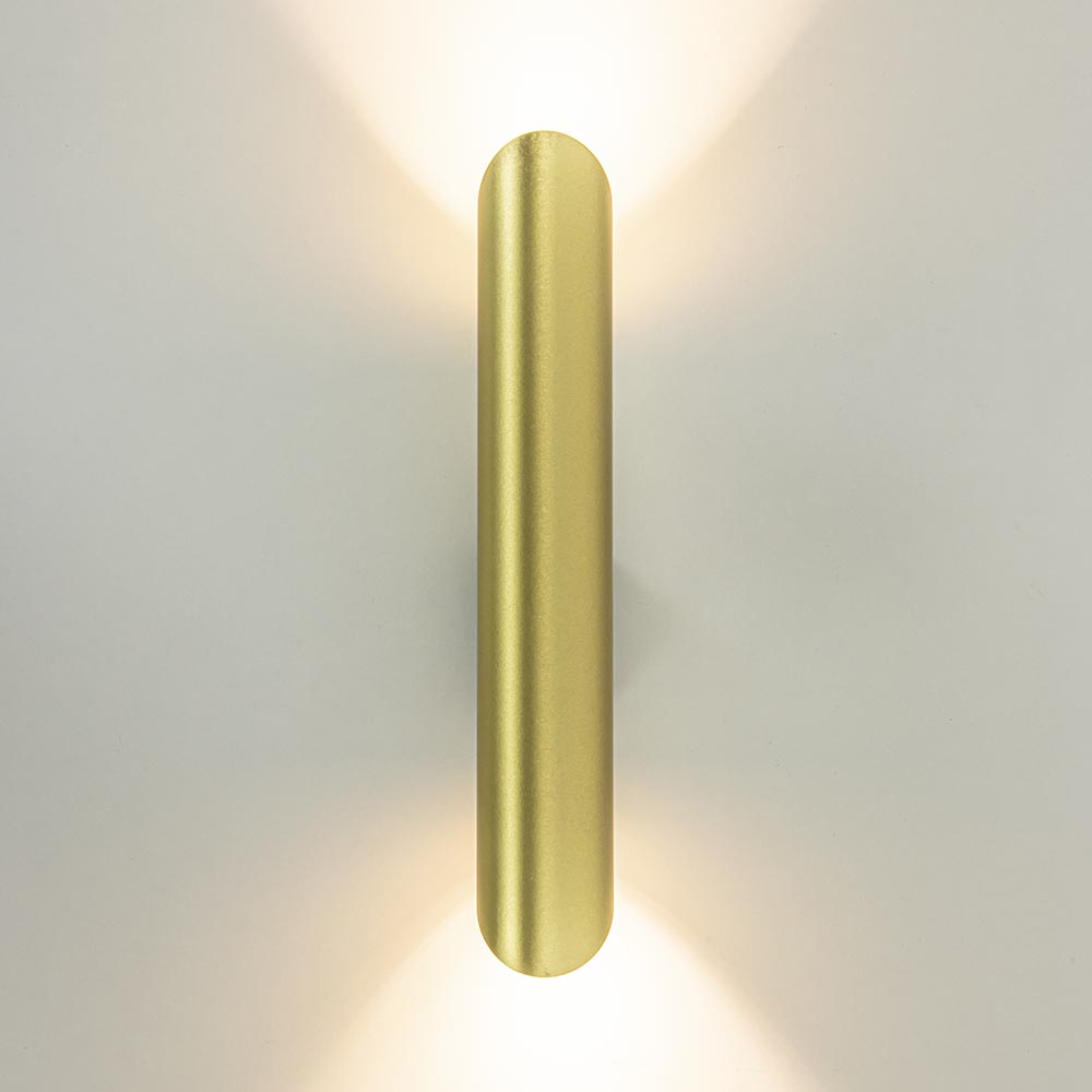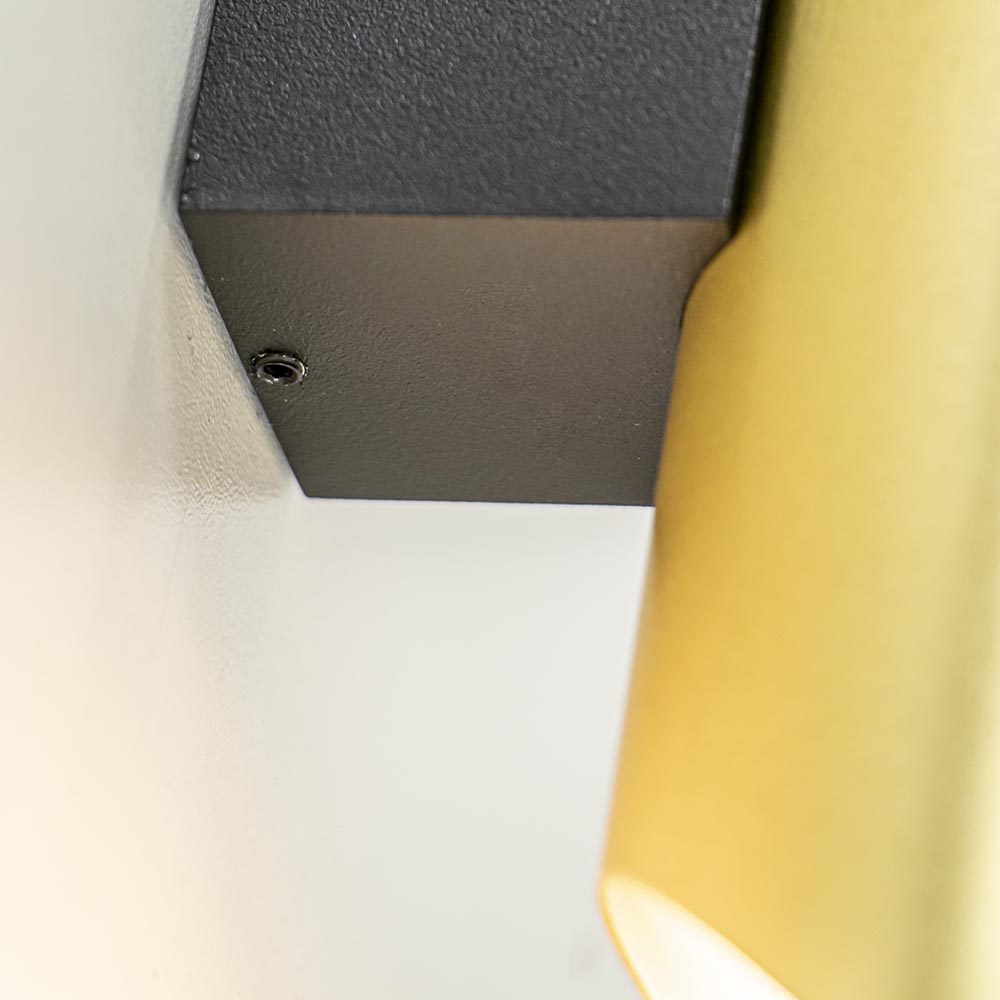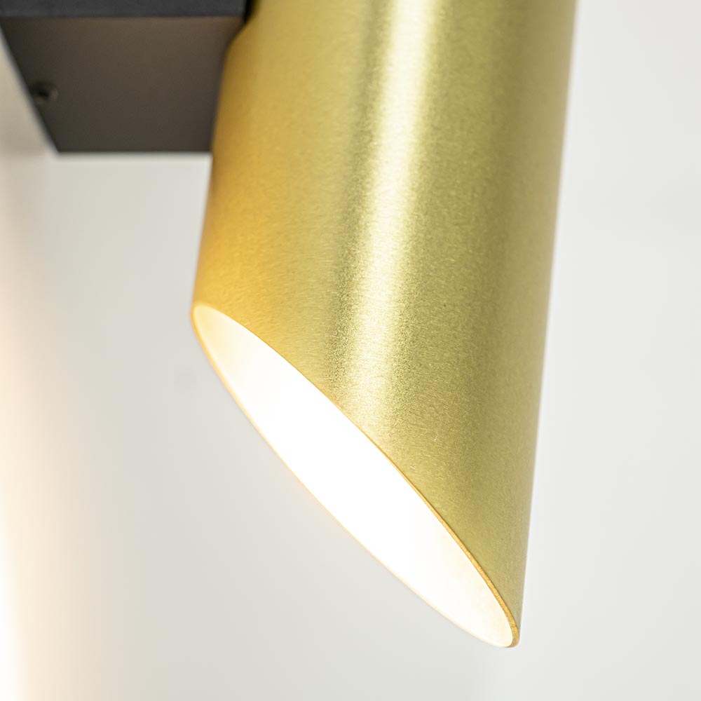 Een fijne toevoeging voor een hal, woonkamer of slaapkamer. Deze sfeervolle wandlamp zorgt voor een mooi effect in de ruimte. De metalen wandlamp is zowel een up en downligter. Dit zorgt dat er een mooi schouwspel aan strijklicht op de wand ontstaat. Ideaal voor net een beetje extra sfeer in het interieur. Daarnaast kan het de architectuur van de ruimte ook extra benadrukken. De cilinder wandlamp is uitgevoerd in het mat zwart met solid brass (goud) en voorzien van 2 GU10 fittingen. Deze kunnen schuiven in de cilinder zodat u de lichtbronnen kunt plaatsen. De wandlamp is niet voorzien van een snoer.