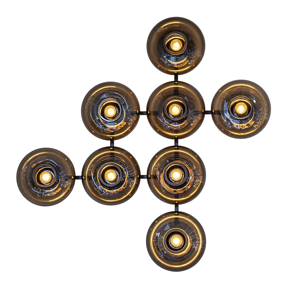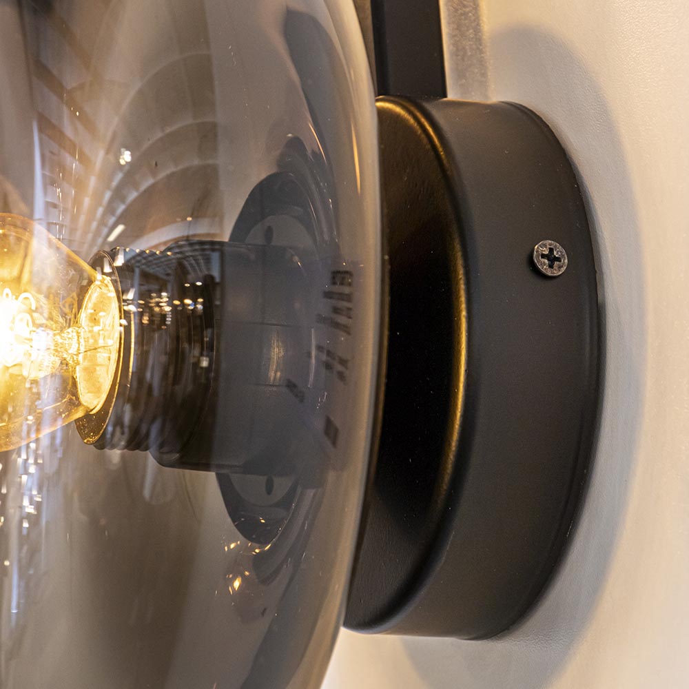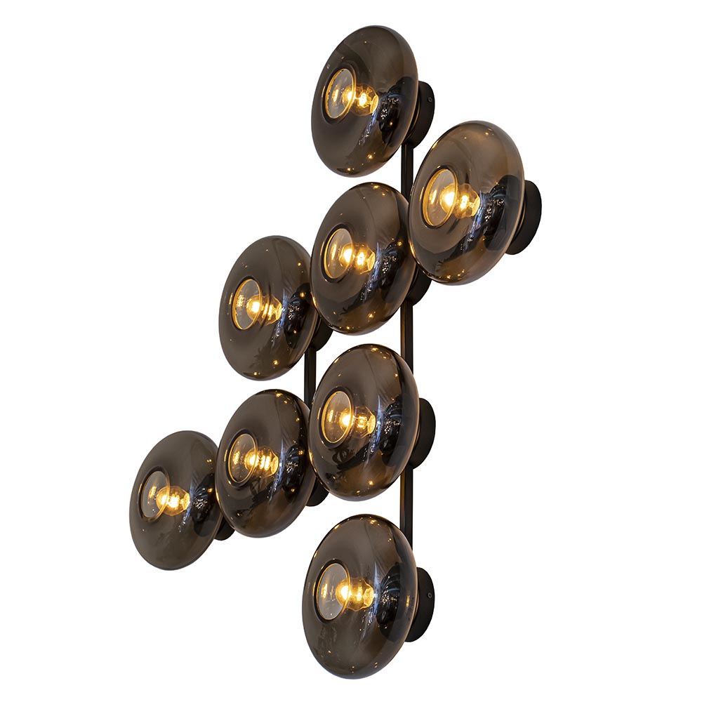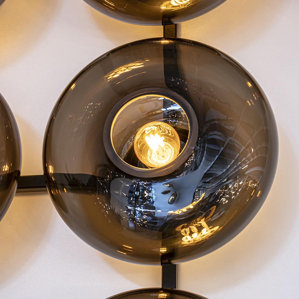 Een prachtig design met een speelse look. Deze grote wandlamp is een echte eyecatcher in het interieur. De wandlamp bestaat uit een mat zwart metalen frame waar 8 lichtpunten op zijn verwerkt. Deze zijn ieder voorzien van een smoke glazen kap. Het donkere glas geeft de wandlamp een luxe uitstraling die wordt versterkt door de vorm van het glas. U kunt de lamp zelf naar wens ophangen. Deze wordt met 2 bevestigingen vastgezet op de muur. Hang de lamp recht van een strakke look, of juist schuin om het speels te maken. De wandlamp is in ieder geval een verrijking voor het interieur.