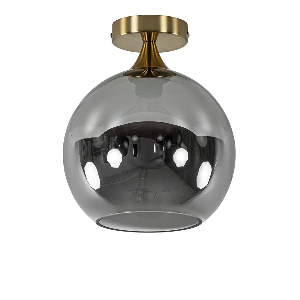 – Omvang: Ø25 x 29 cm – Plafondbevestiging: Ø11 x 7 cm – Kap: Ø25 cm – Metaal, goud – Smoke/titanium glas – Exclusief lichtbron (E27) – Dimbaar (exclusief)