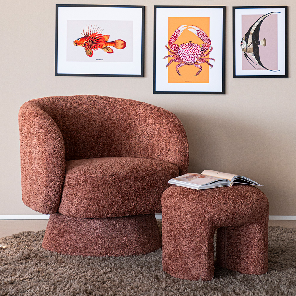 De “Balou” terracotta draaifauteuil voegt met zijn warme kleur en knuffelzachte bouclé stof direct sfeer en karakter toe aan iedere zithoek.